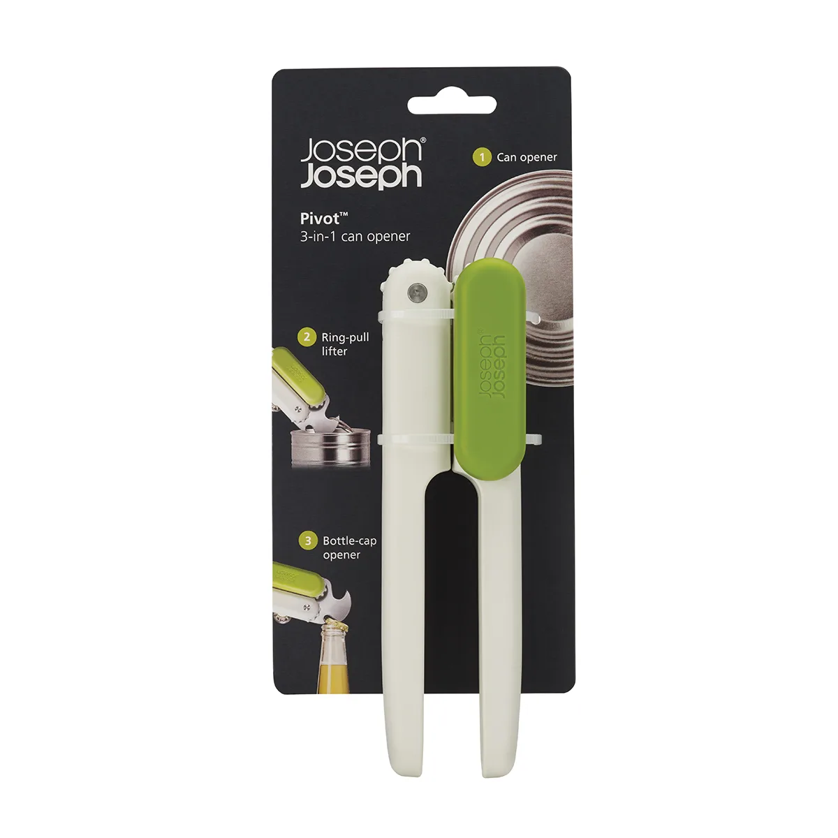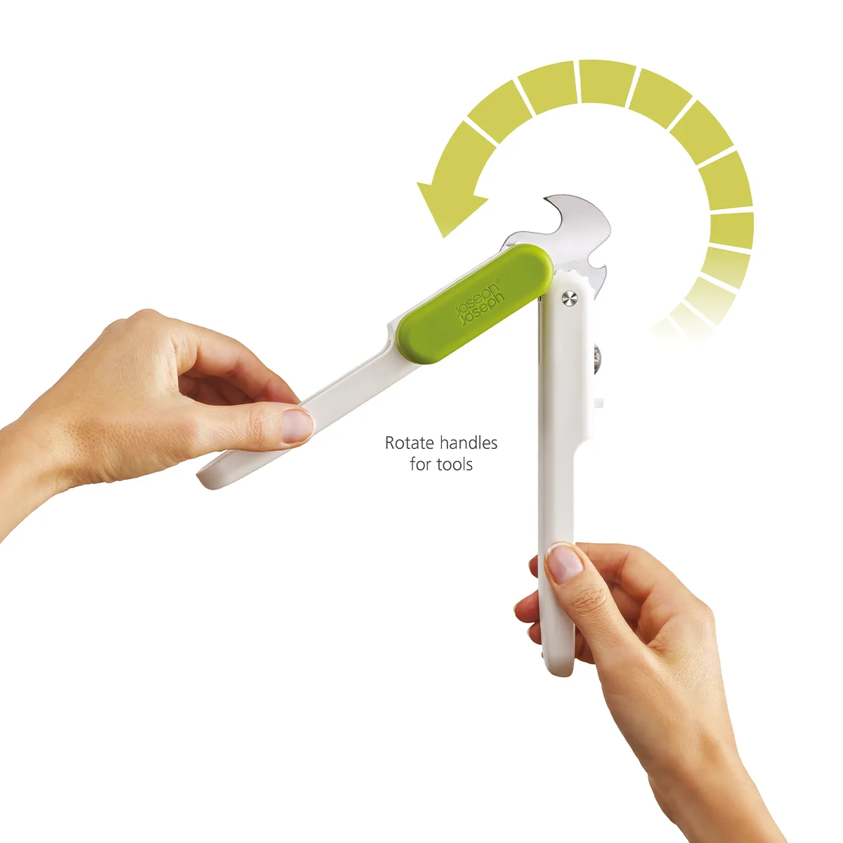 Esta herramienta multifuncional combina un abrelatas, un abrebotellas y un tirador de anillo en un dispositivo compacto que ocupa menos espacio cuando se almacena en su cajón.