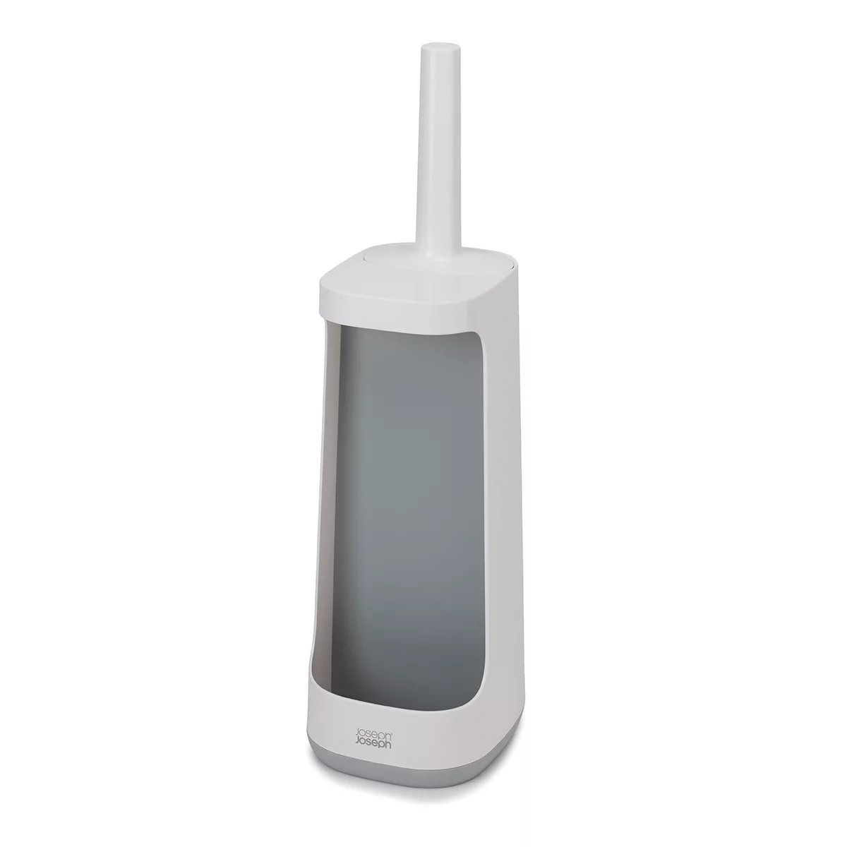 Esta revolucionaria escobilla de baño viene con un práctico carrito para que puedas guardar ordenadamente botellas de lejía o aerosoles fuera de la vista.