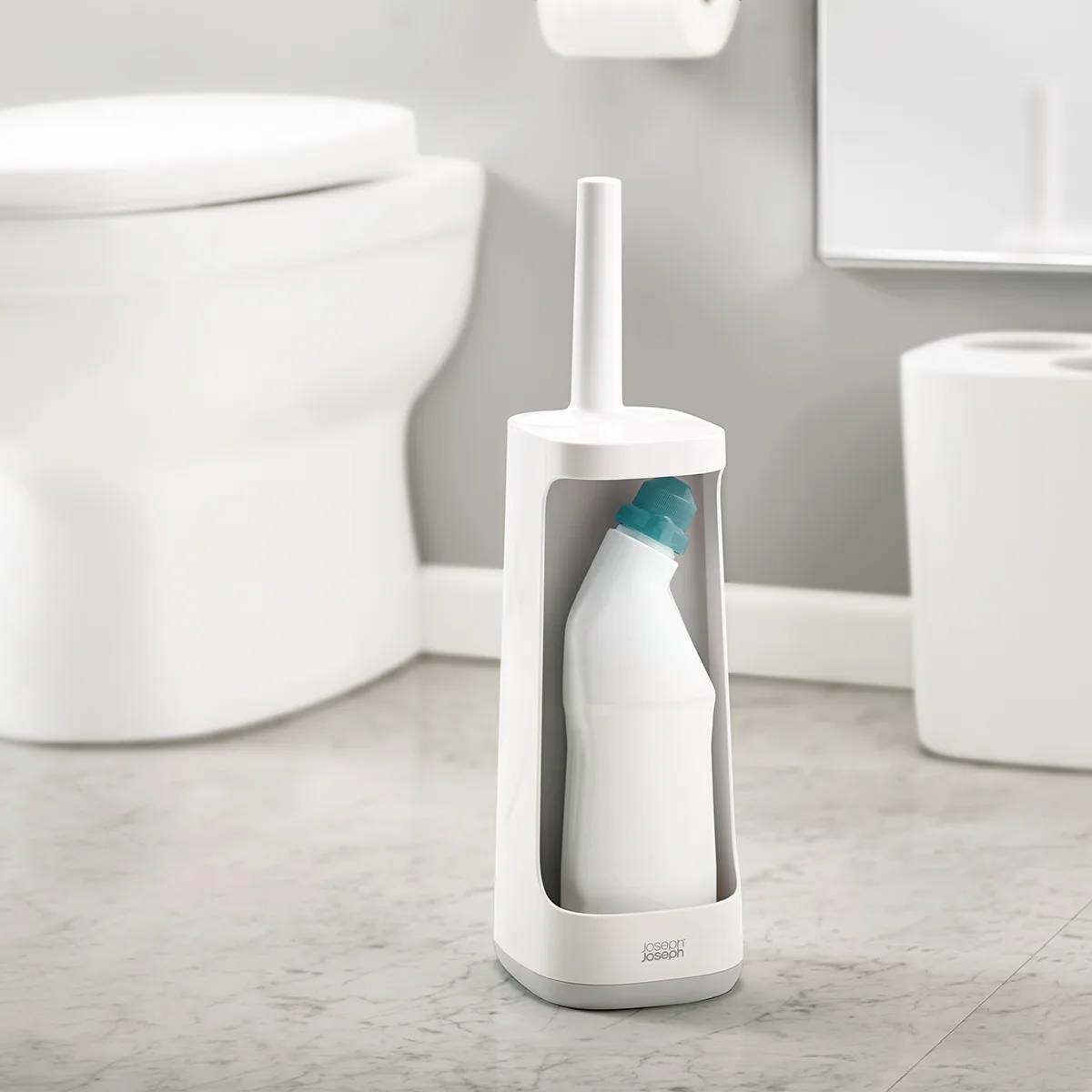 La escobilla de baño Flex™ Store revoluciona la limpieza del inodoro con su cabeza flexible en forma de D que alcanza incluso debajo del borde. Su diseño antigoteo y antiobstrucción garantiza higiene y practicidad, mientras que el carrito integrado oculta productos de limpieza para un baño más ordenado y elegante.