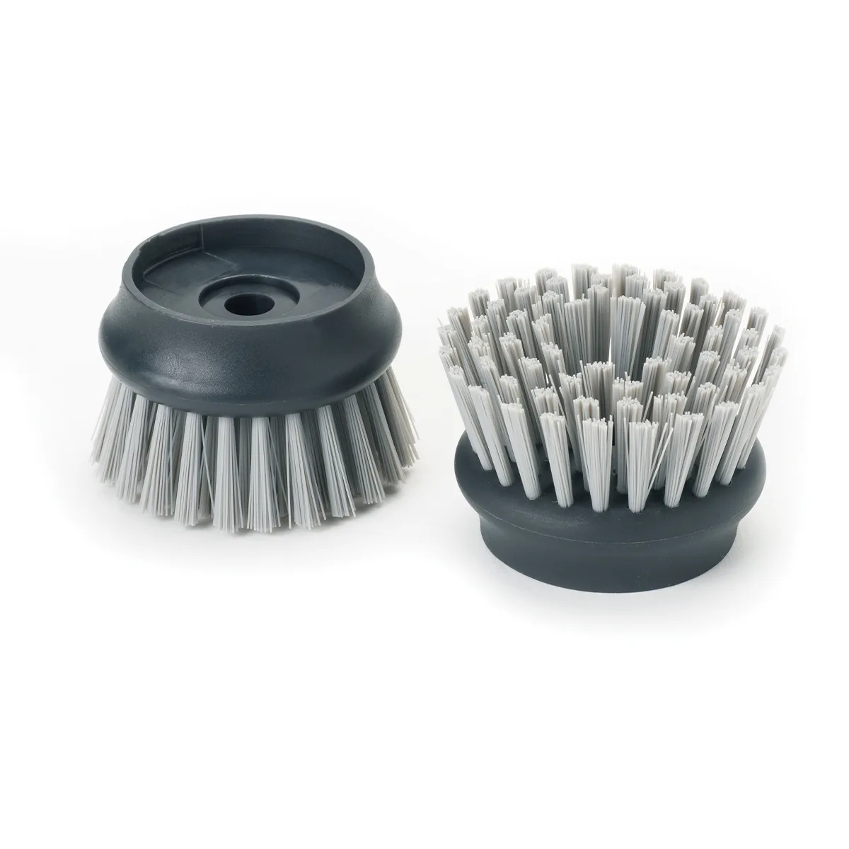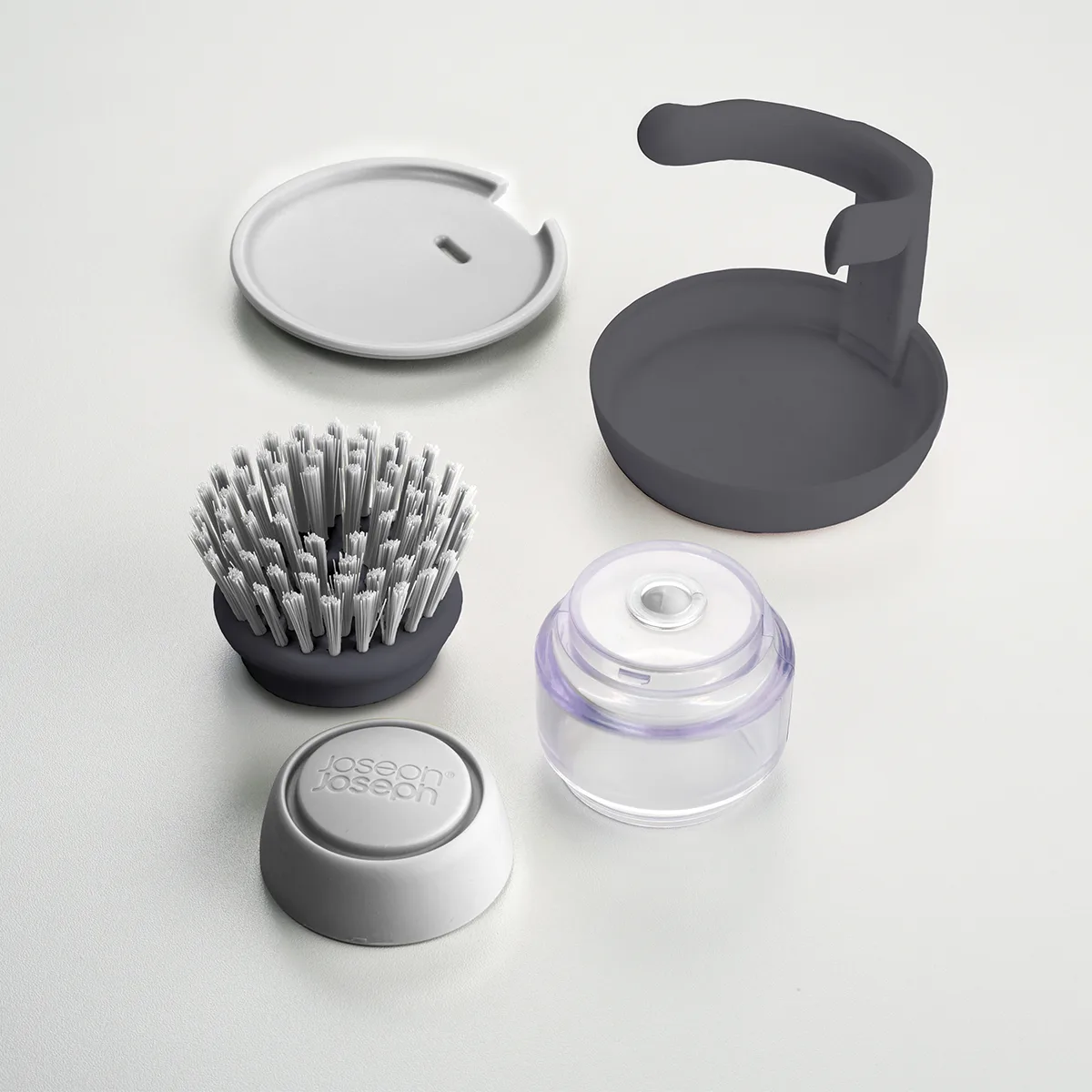 Este robusto cepillo de mano para lavar platos cuenta con un depósito de fácil llenado que dispensa la cantidad necesaria de jabón con solo presionar el botón superior.