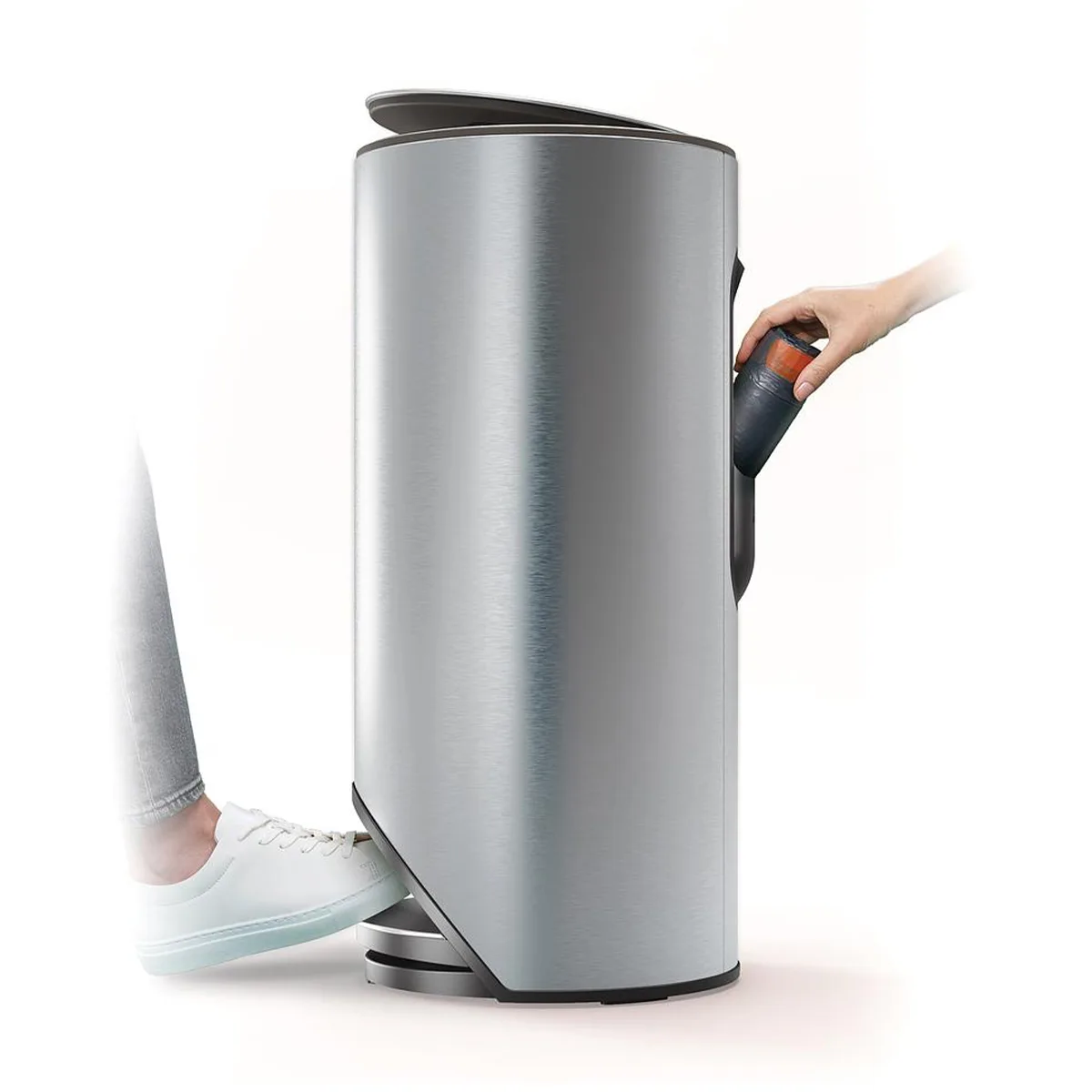 Pedal grande y fácil de presionar con tamaño compacto. Compartimento para guardar las bolsas de basura en el reverso. Control de olores integrado con filtros de carbón activo reemplazables. Tapa de cierre suave con revestimiento antihuellas y cubeta extraíble. Capacidad: 30 litros