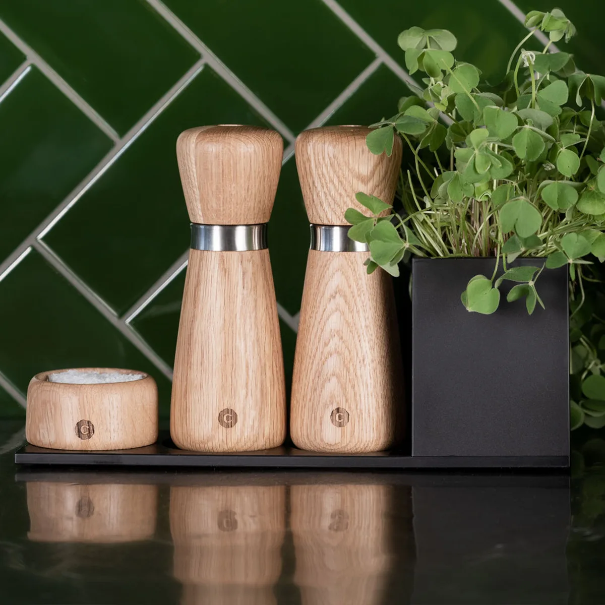 El contraste entre las piezas de madera blandas y orgánicas y la precisión de la superficie de acero cepillado añade una sensación de calidad al producto que lo diferencia de los molinillos de madera tradicionales.