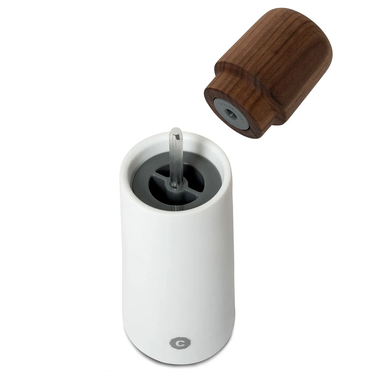 El cuerpo del molinillo está hecho de porcelana blanca mate y la tapa es de madera de nogal.