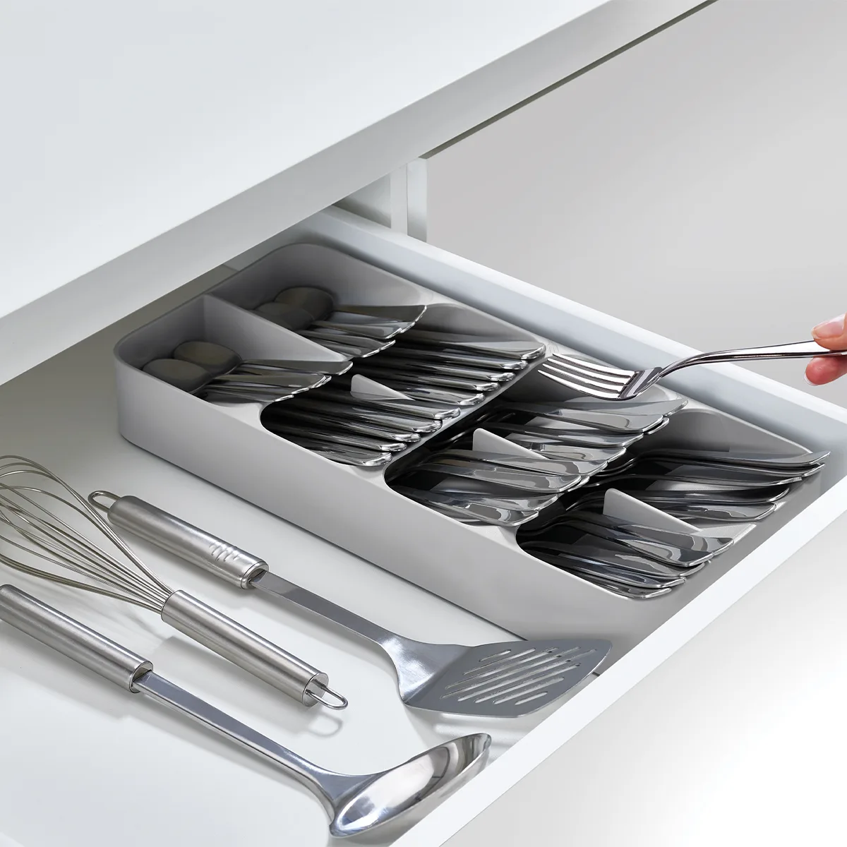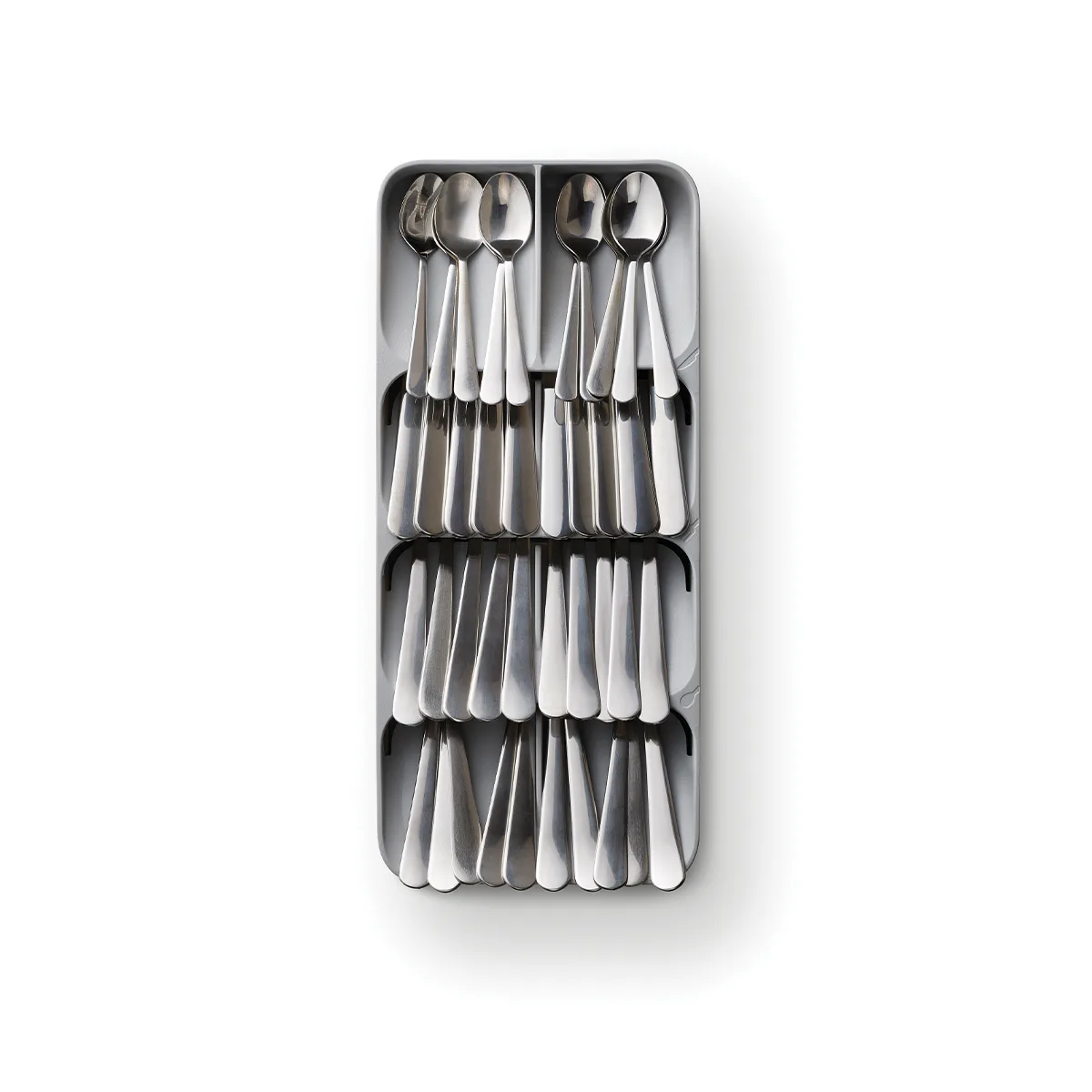 El diseño único de esta bandeja para cubiertos cuenta con compartimentos en ángulo que se superponen para que se puedan almacenar más cubiertos en menos espacio.