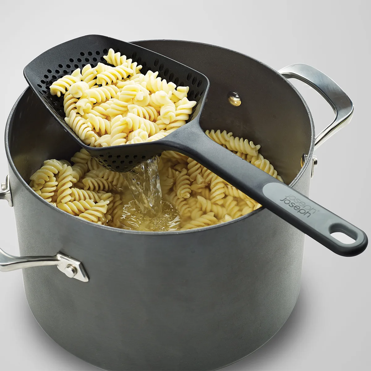 Este utensilio simple pero súper práctico te permite sacar, escurrir y servir directamente desde una sartén caliente o una bandeja para horno. Tiene pequeños ganchos que le permiten descansar sobre el borde de la sartén para escurrir fácilmente.