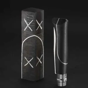 El Padouk es una madera africana densa con un grano fino. Su color varía de marrón púrpura a rosado con vetas púrpuras. El mango está barnizado para protegerlo de la humedad y la suciedad.