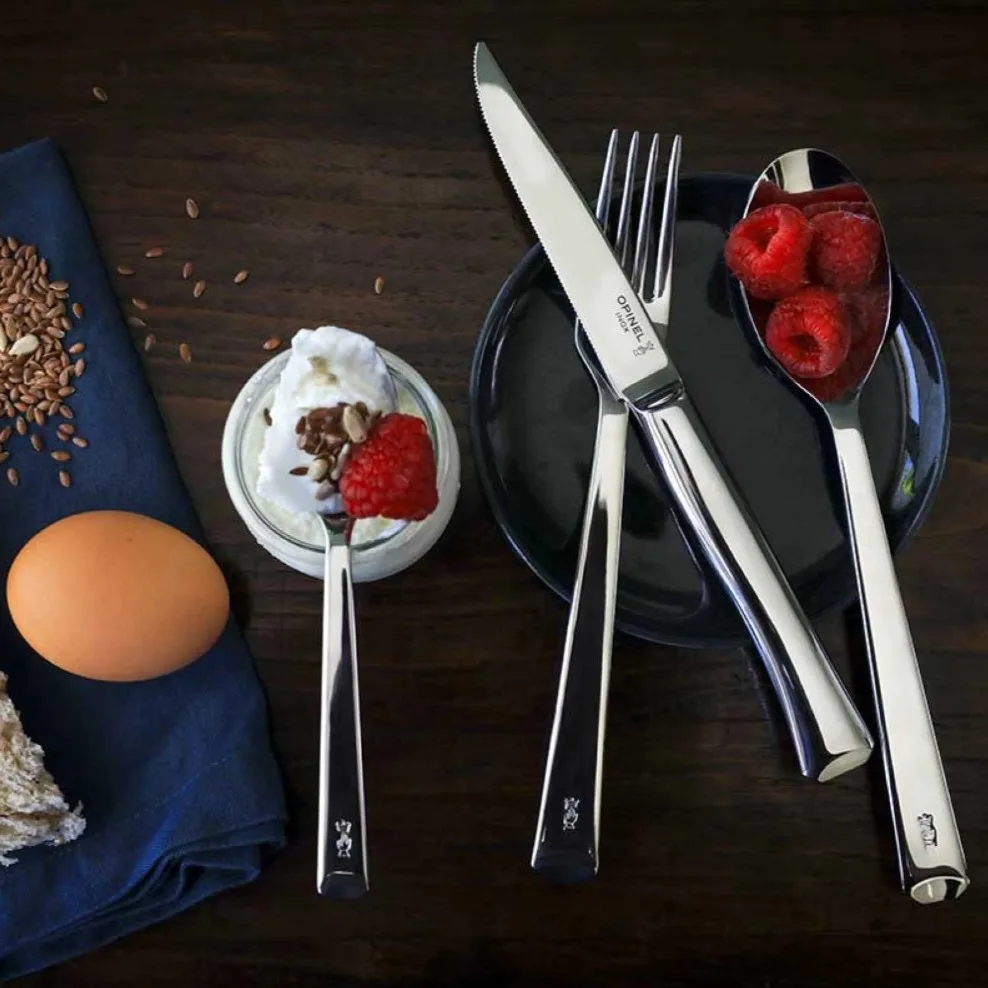 La colección de cubiertos Perpétue encarna la tradición de Opinel combinada con un diseño contemporáneo, para un elegante conjunto de utensilios de acero inoxidable. Destinada a mejorar la reunión alrededor de la mesa en todas sus formas, la colección de cubiertos Perpétue es ideal para el uso diario (¡apta para lavavajillas!) y complementará los cubiertos en mesas informales y elevadas por igual. El tenedor, la cuchara y la cucharita tienen un diseño puro y simple y el cuchillo cuenta con un cómodo mango de acero redondeado y una hoja microdentada que es eficiente y duradera.