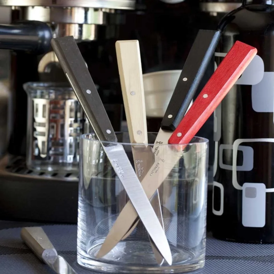 La caja contiene 4 cuchillos: color pimiento, rojo, carpe natural y negro.