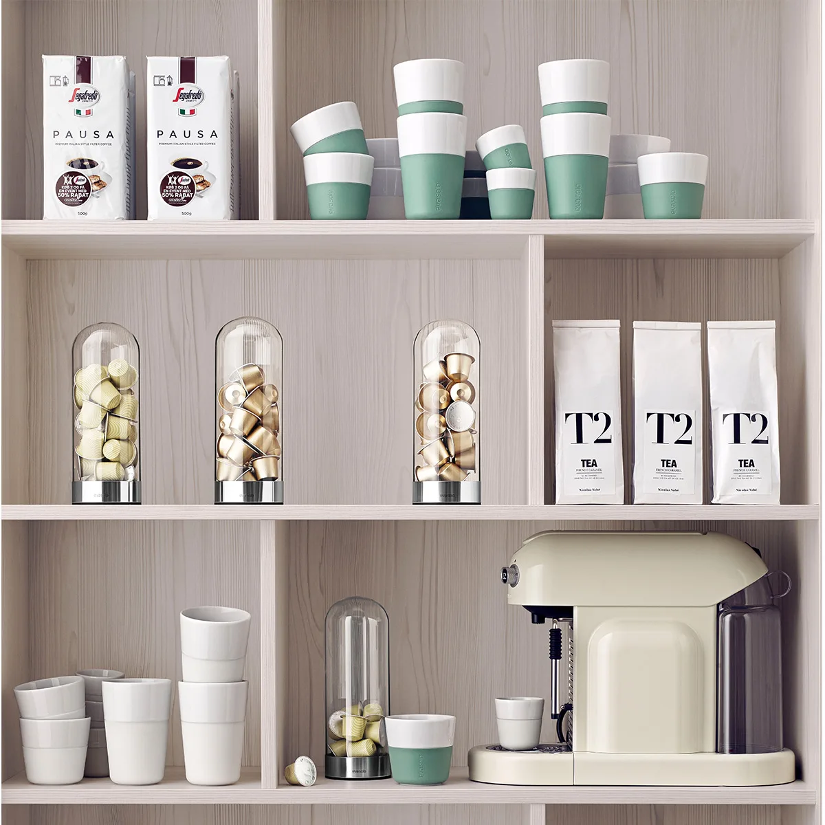El dispenser de cápsulas Eva Solo Coffee es una forma decorativa de almacenar sus cápsulas de café, y el recipiente de vidrio en forma de cilindro le permite ver exactamente cuántas cápsulas de colores le quedan. La base cuenta con solapas de silicona suave que retienen las cápsulas, pero que le permiten quitar fácilmente una cápsula a la vez con los dedos. Cuando sea necesario rellenar el dispenser, simplemente retire la base y vierta hasta 25 cápsulas en el recipiente. Mezcle cápsulas de diferentes colores en un solo dosificador, o coloque varios dispensadores uno al lado del otro, cada uno con sus cápsulas de café de diferente color.