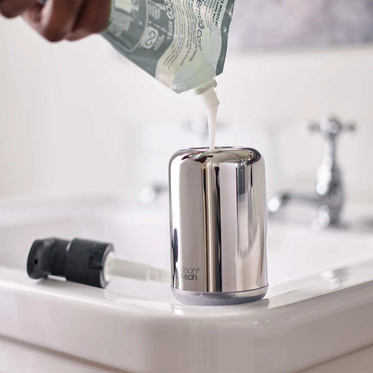 Este elegante dispenserr de jabón cuenta con un cabezal de bomba de fácil empuje, una base antideslizante y contiene hasta 300 ml de jabón líquido. Su acabado de acero inoxidable pulido es toda una declaración de intenciones en el baño.