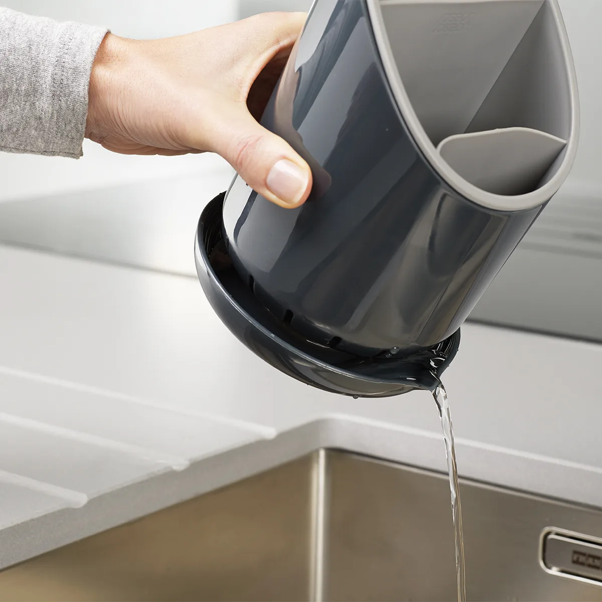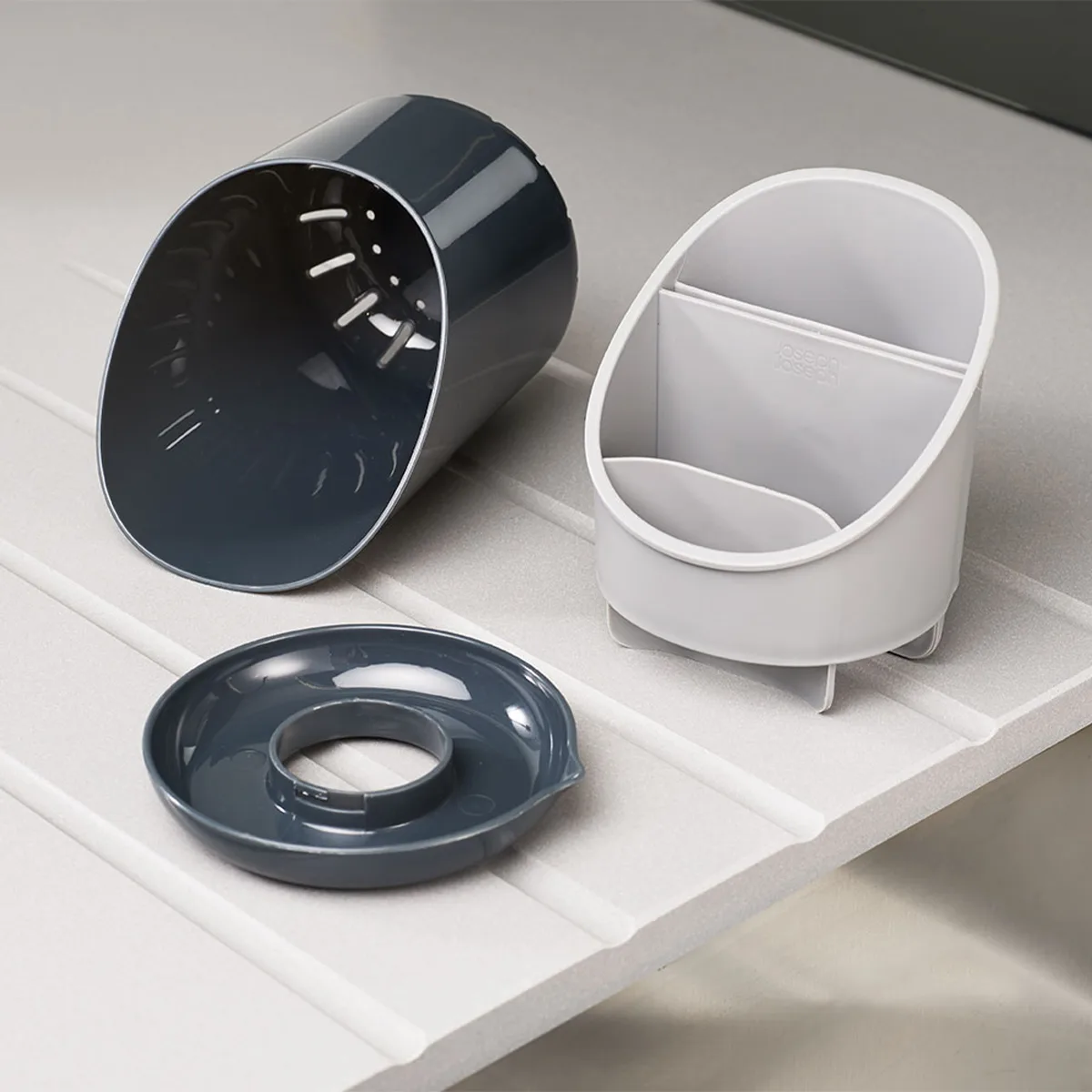 Este práctico escurridor de cubiertos tiene compartimentos escalonados para ayudarlo a separar diferentes artículos y un platillo integrado para recoger el exceso de agua.