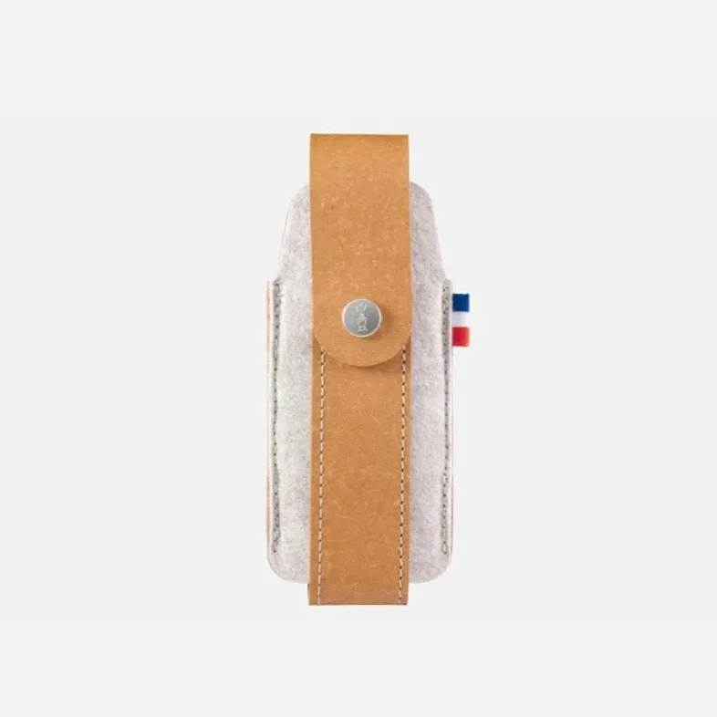 La funda mediana para exteriores forma parte de la línea de fundas Collection France, diseñada por el estudio de diseño BIG-GAME y fabricada en Francia. La funda mediana para exteriores se fabrica en Saboya, Francia, con un enfoque en materiales respetuosos con el medio ambiente. Utilizando cuero regenerado, un material ecológico creado con fibras de cuero de desecho y materiales de origen vegetal, las fundas Collection France son una nueva forma sostenible de llevar tu cuchillo Opinel favorito.