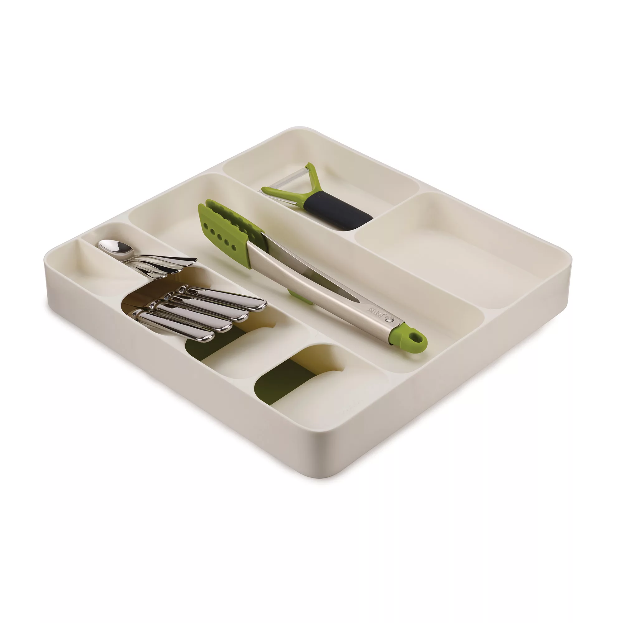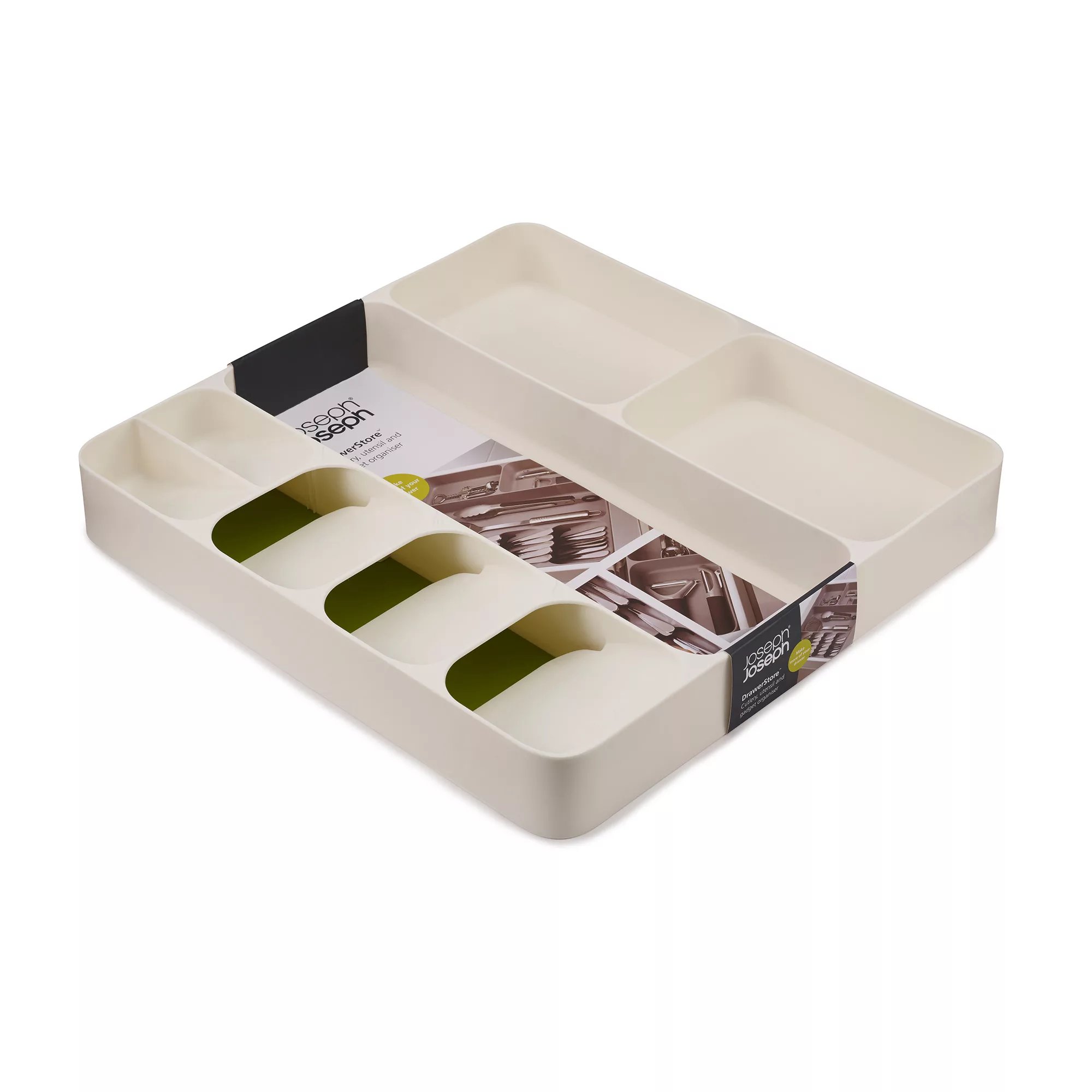 • El organizador de cubiertos y utensilios DrawerStore combina cinco compartimentos superpuestos para almacenar cubiertos con tres compartimentos profundos para guardar cubiertos y utensilios.