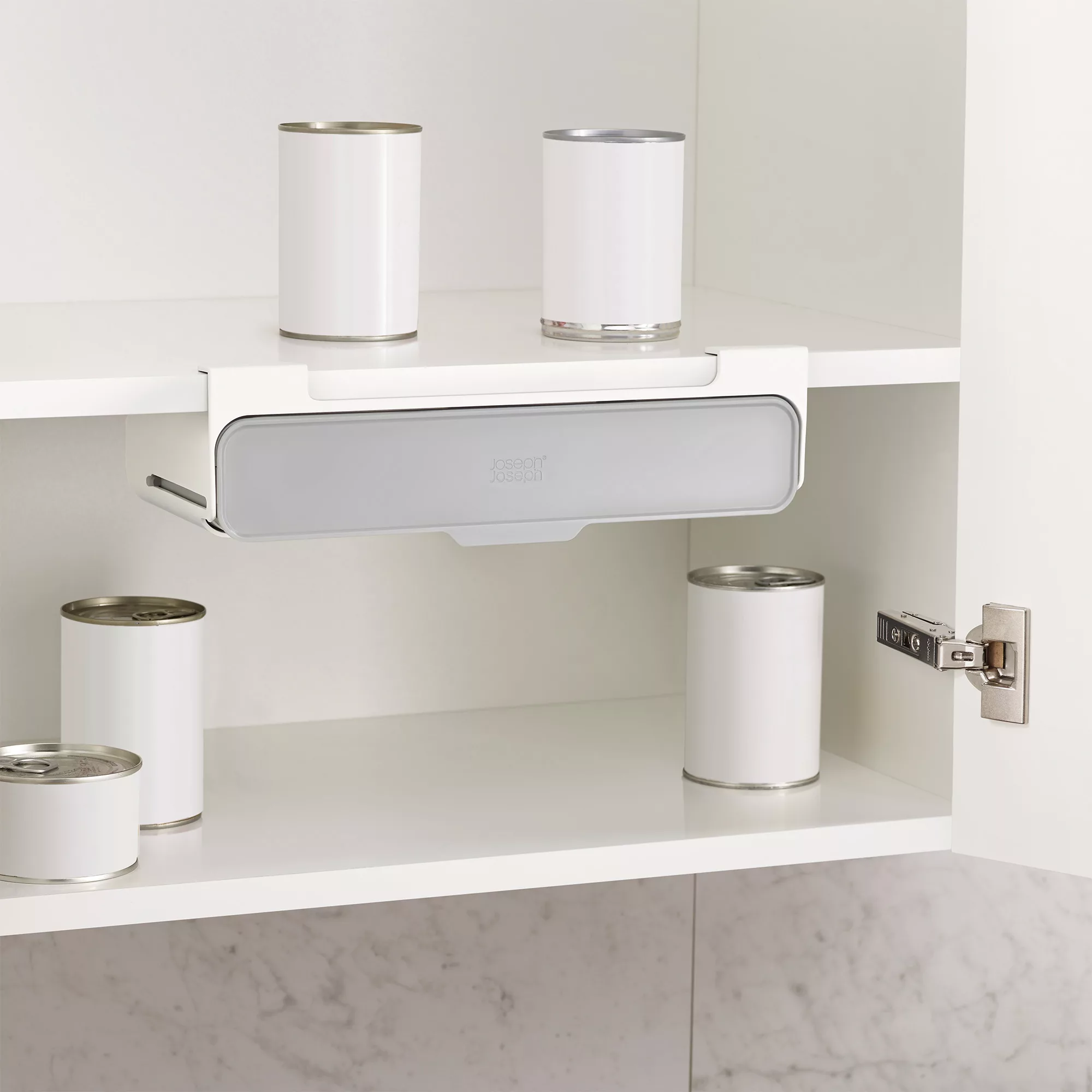 Ante los frecuentes problemas de espacio en los armarios, este innovador diseño aprovecha el espacio que no se usa bajo el estante. Dispone de un ingenioso compartimento extraíble con capacidad para un máximo de siete tarros de especias estándar (no incluidos). La unidad se acopla perfectamente a los estantes y resulta fácil de instalar usando la potente cinta 3M™ VHB™. Apto para muebles de cocina con una anchura superior a 32 cm. Grosor máximo del estante: 2 cm.