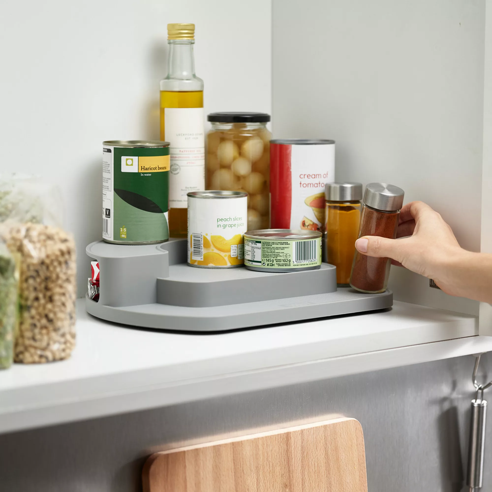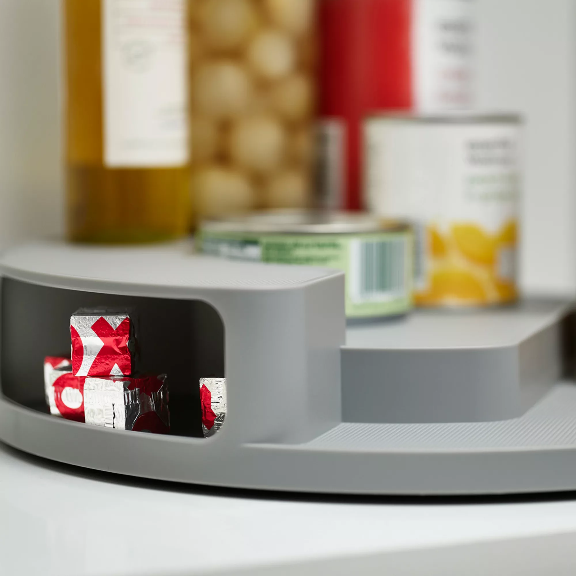 Mejore la visibilidad y el acceso a los armarios con esta solución sencilla y efectiva. Comprende una plataforma baja con tres alturas sobre una base giratoria, de manera que el acceso es sencillo desde todos los ángulos y los objetos de atrás se elevan. Al girar la plataforma aparecen prácticos compartimentos en la parte posterior de la unidad, perfectos para guardar objetos sueltos como pastillas de caldo y cajas o tubos pequeños.