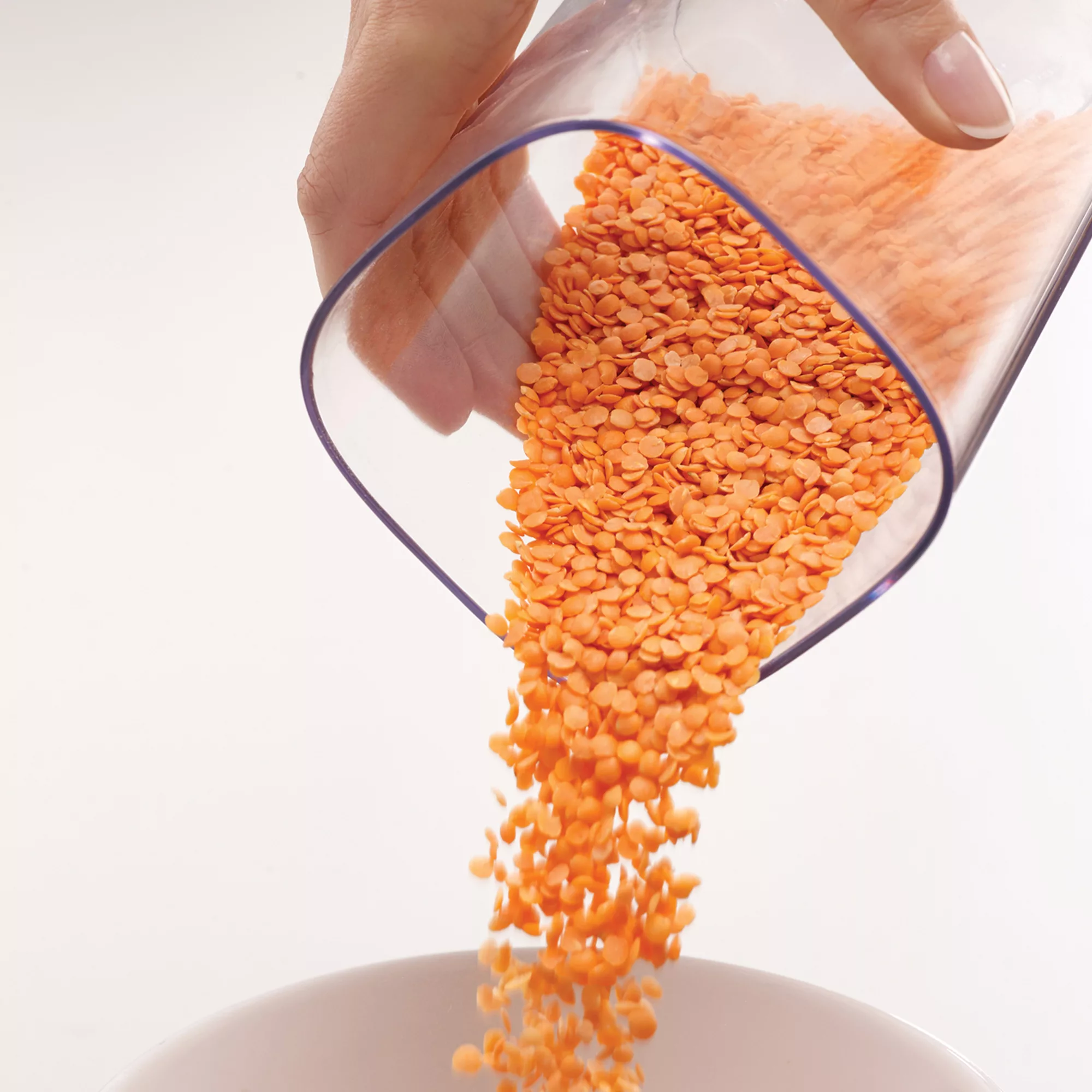 Este elegante juego de recipientes cuenta con un inteligente soporte de almacenamiento que permite un acceso sencillo a cualquier tarro, independientemente de su posición.Cada recipiente tiene una tapa con un sello hermético de silicona, esquinas que facilitan el vertido y una base que permite colocarlo de forma segura en el soporte.