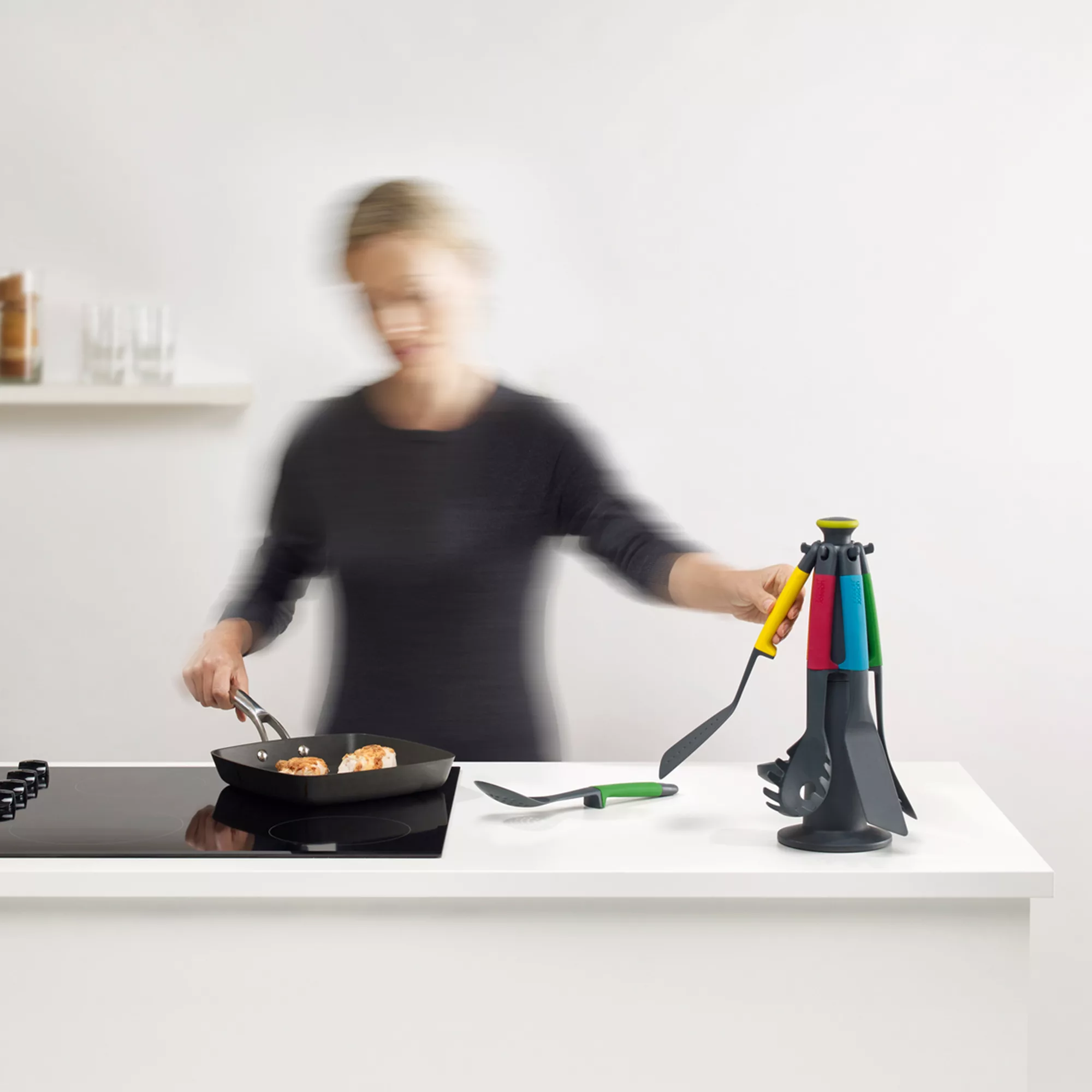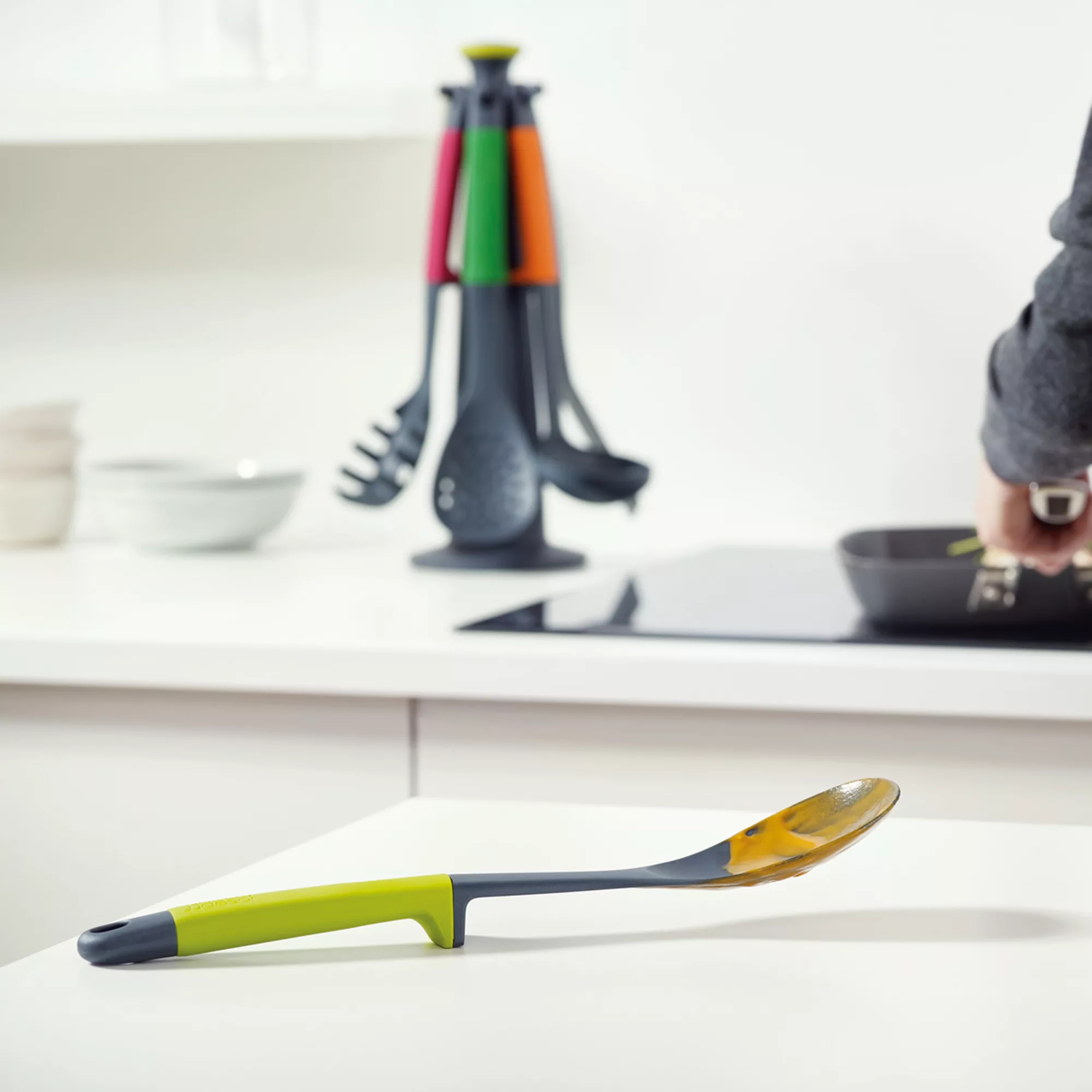 La gama Elevate™ de utensilios de cocina ha sido diseñada especialmente para mejorar la higiene y minimizar la suciedad que se crea al colocar los utensilios en las superficies de la cocina durante el uso. Cada utensilio tiene un innovador mango con peso que lleva un soporte integrado, lo que garantiza que el cabezal del utensilio Elevate™ quede elevado y no toque la superficie de trabajo cuando se coloca sobre ella.