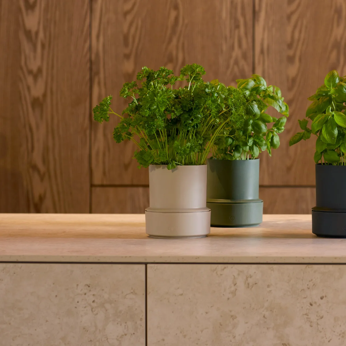 Maceta con sistema de autorriego inteligente. Mantiene tus plantas hidratadas sin riego diario. Fabricada con 75% de plástico reciclado. Diseño moderno de Sam Murley, ideal para hierbas frescas y decoración sustentable.