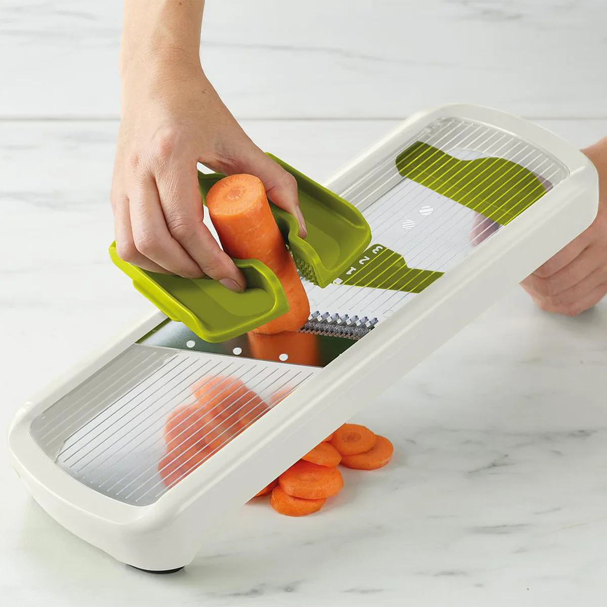 Cortadora de mandolina segura para cortar uniformemente una variedad de frutas y verduras.
