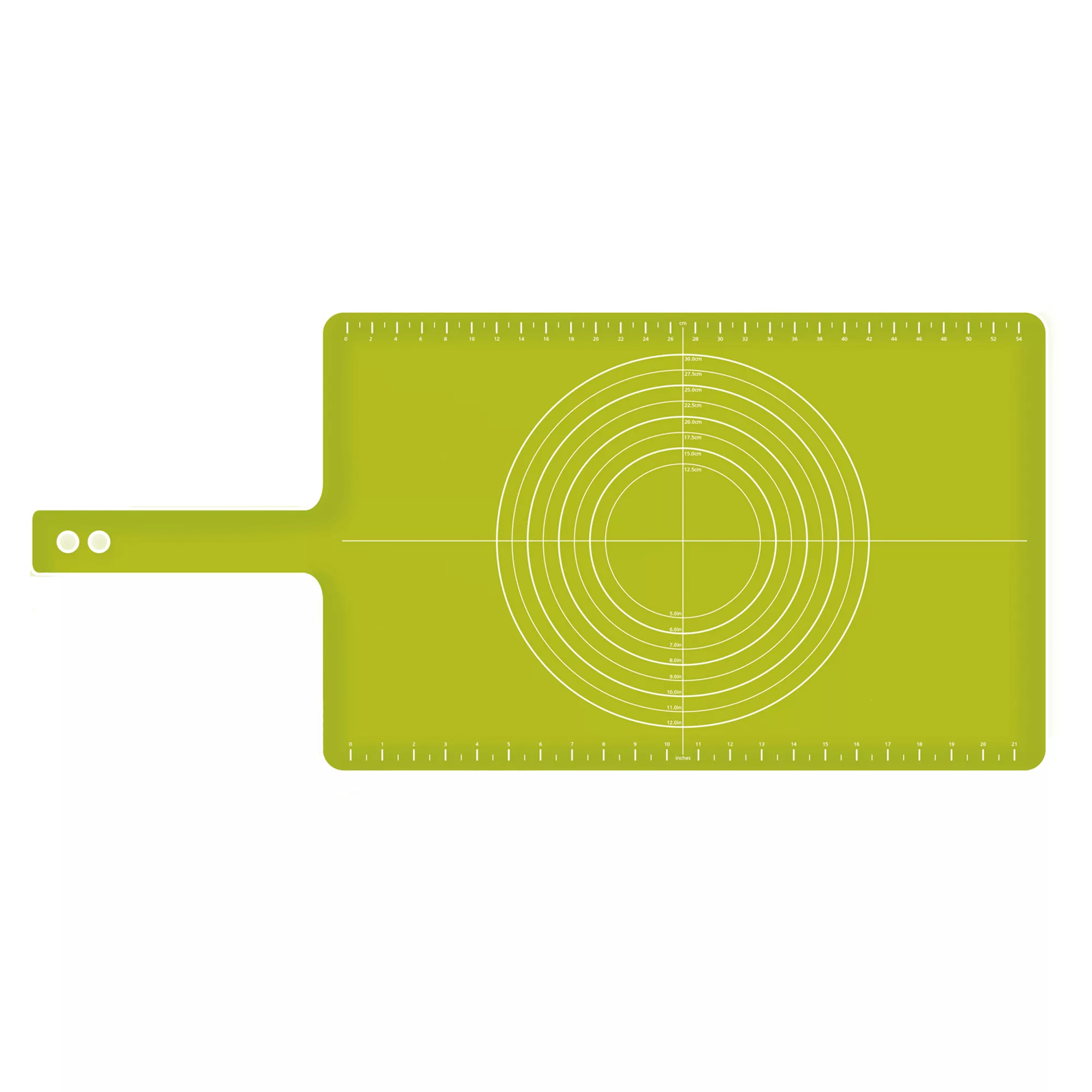 Guía de tamaño de rollo impresa para preparar masa en el mismo mat, y va de 0 a 54 cm a lo largo de un borde y de 12,5 a 30 cm de diámetro en el medio