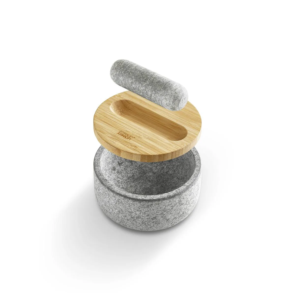 La tapa de bambú mantiene el mortero limpio y libre de polvo cuando se almacena