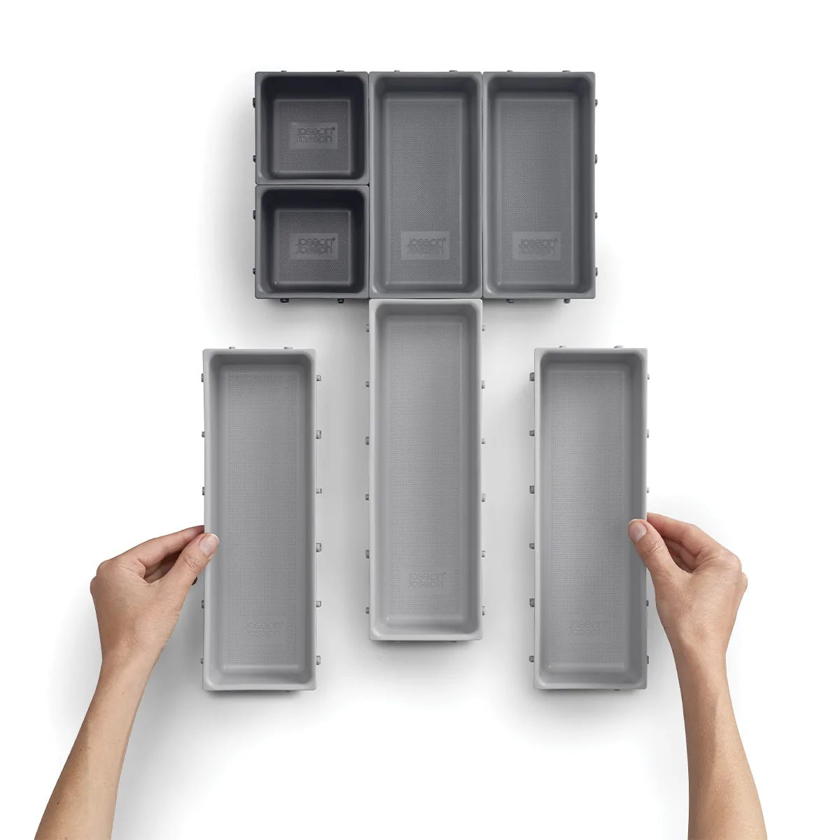 Optimiza el espacio de tus cajones con esta solución versátil y personalizable. Las siete bandejas individuales se pueden enganchar por todos los lados, permitiéndote configurar la organización según tus necesidades y el espacio disponible.