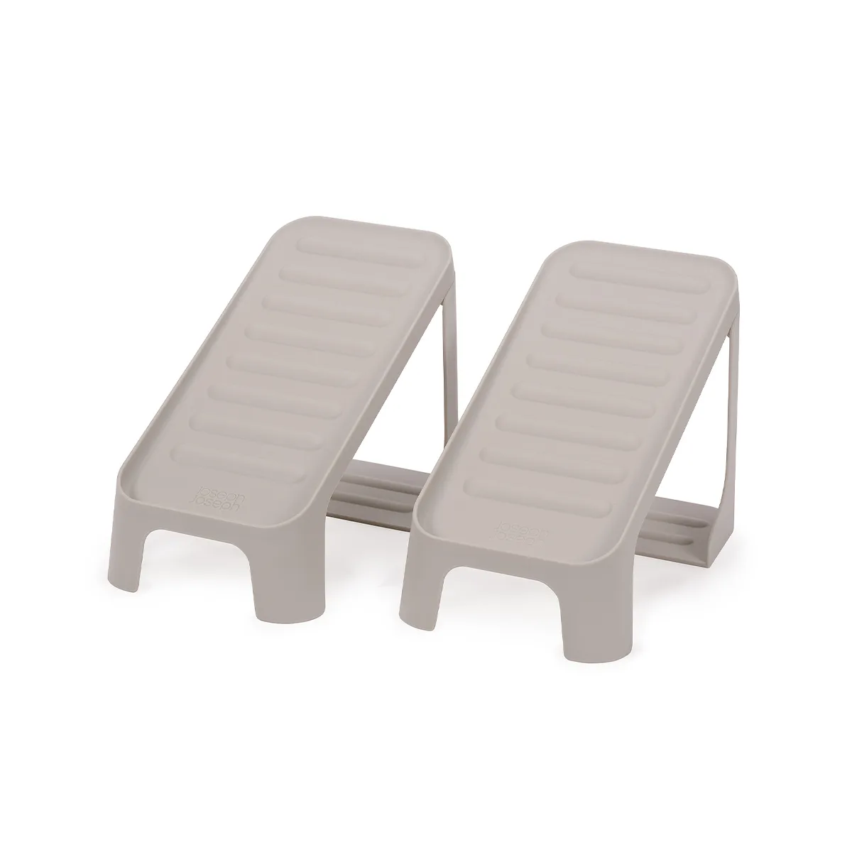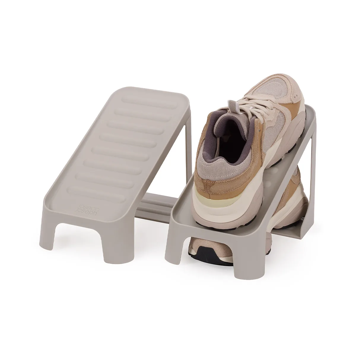 El diseño escalonado ahorra espacio. El nivel superior abatible facilita el acceso a ambos zapatos. Superficie rugosa para evitar que los zapatos resbalen. Cada organizador tiene capacidad para un par de zapatos. Perfecto para usar en estantes o dentro de armarios y alacenas.