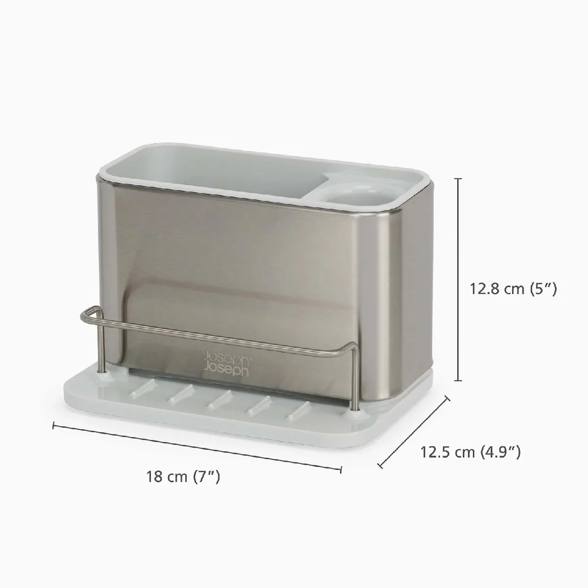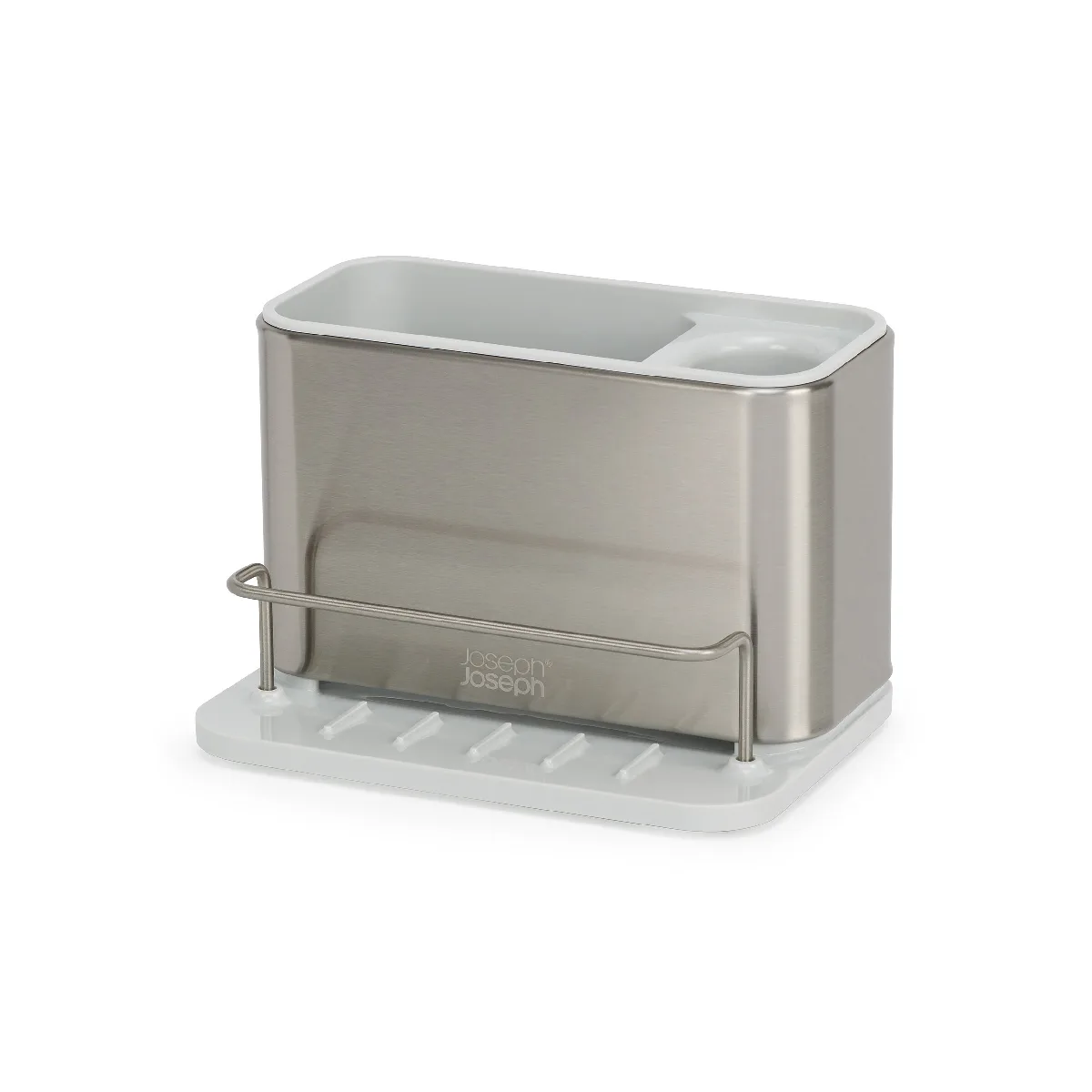 El organizador de bacha Surface es un accesorio de diseño en acero inoxidable con recubrimiento anti-huellas. Cuenta con compartimentos para cepillos, barra para paños y una base inclinada que drena el agua. Incluye patas antideslizantes y es totalmente desmontable para su limpieza.