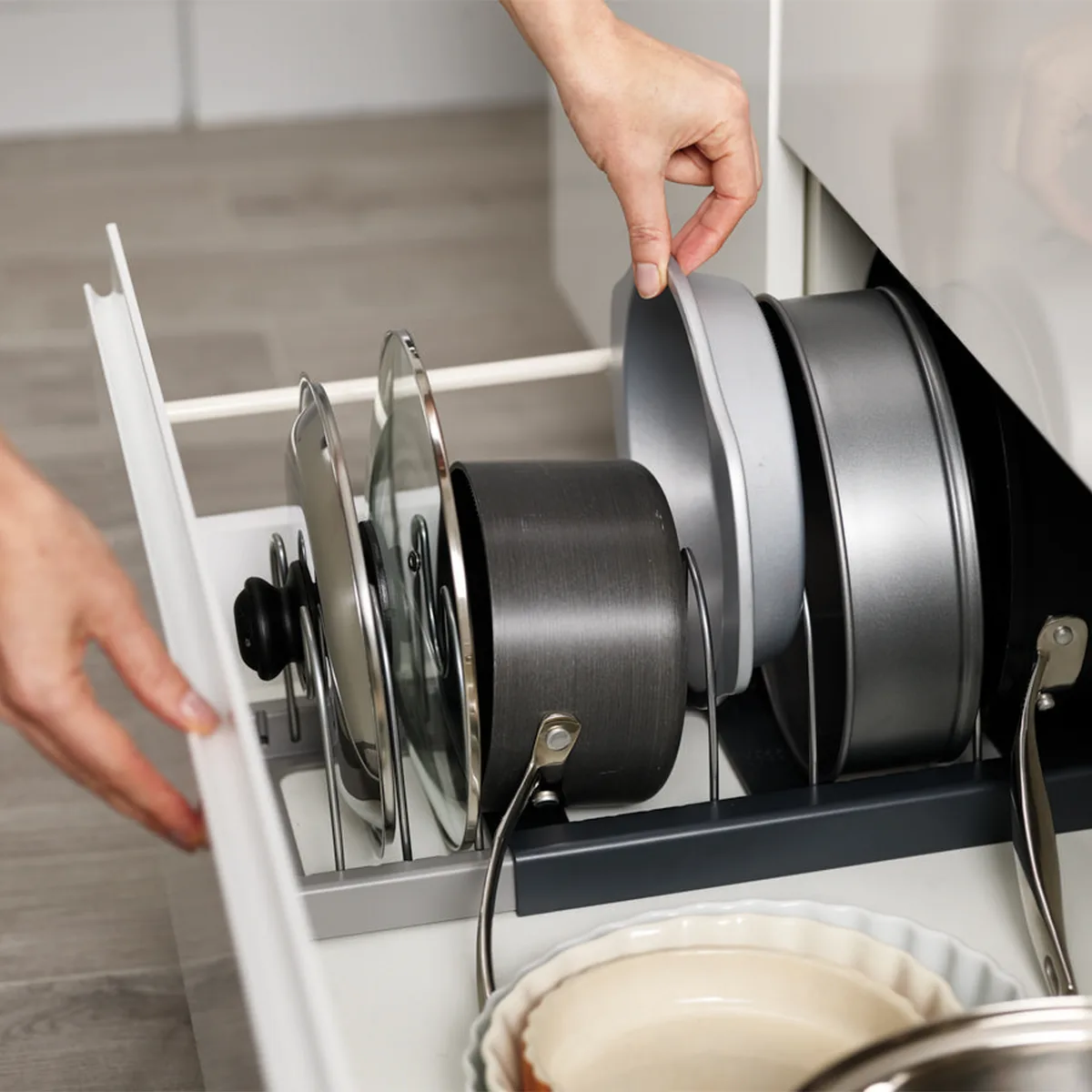 Perfecto para almacenar una variedad de sartenes, tapas y moldes para hornear