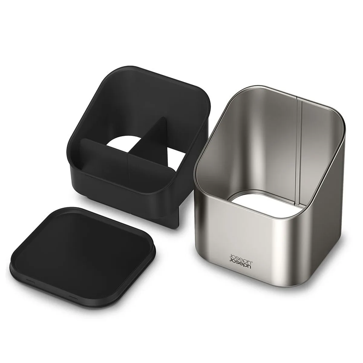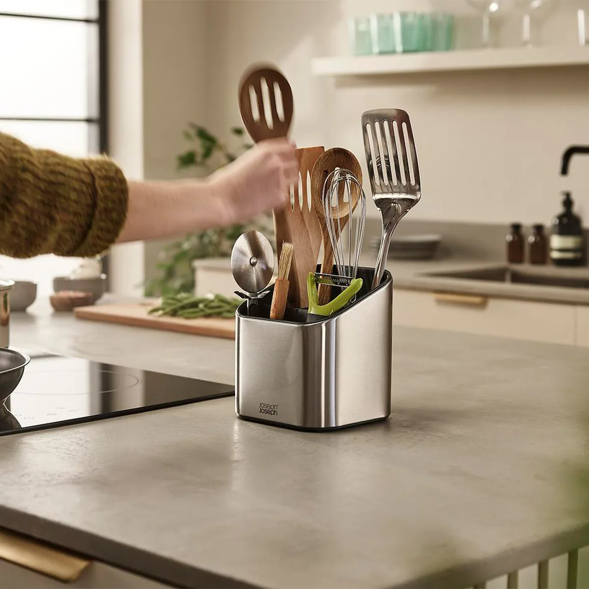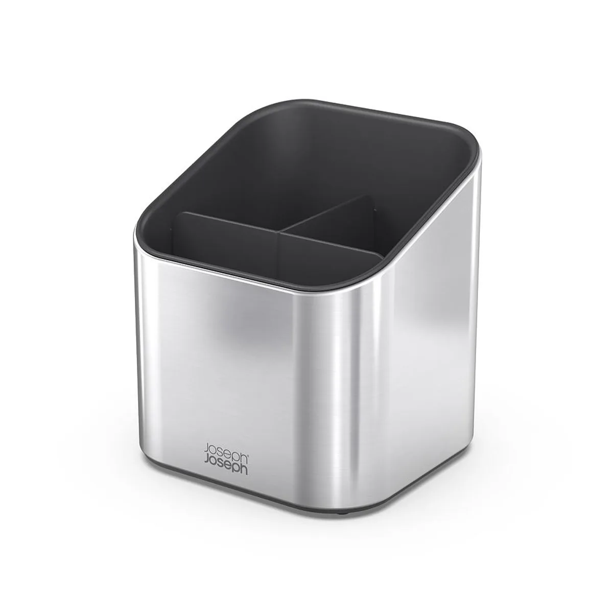 Guarde una variedad de elementos esenciales de cocina de diferentes tamaños en nuestro organizador para utensilios de acero inoxidable. Su diseño en ángulo y sus divisores facilitan la organización y el acceso a cada artículo, mientras que un revestimiento a prueba de huellas dactilares y una base antideslizante garantizan que el organizador se mantenga limpio y resistente en la mesada. La superficie se desmonta por completo para facilitar la limpieza.