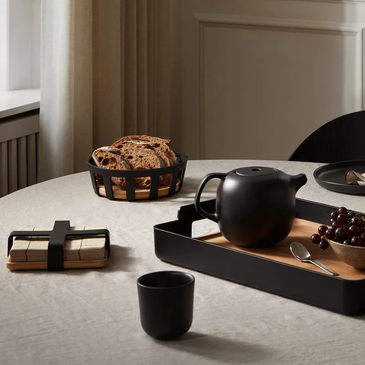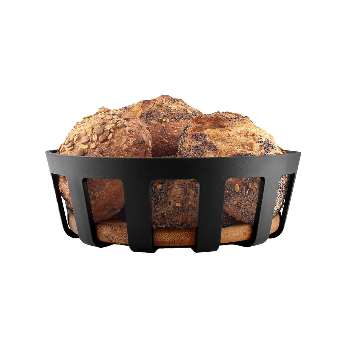 Ideal para servir pan recién horneado o presentar fruta fresca en la mesa. Su diseño minimalista combina plástico negro mate con bambú certificado FSC®, aportando un toque elegante y natural a cualquier ambiente. Fácil de mantener, perfecta para el uso diario.