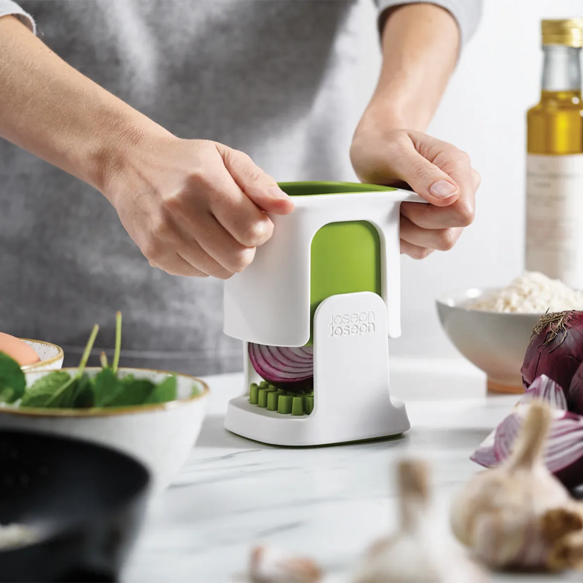 Esta picadora de verduras inteligente y compacta es perfecta para picar cebollas rápidamente o para hacer papas fritas o palitos con patatas, zanahorias y calabacines.