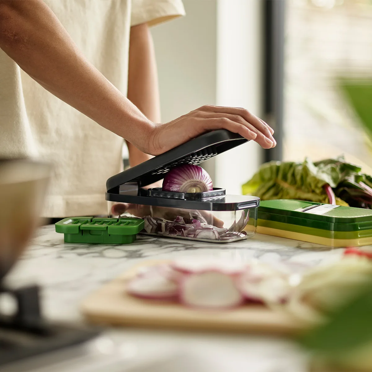 Incluye cuatro cuchillas intercambiables para diferentes tipos de corte: picador, rallador, rebanador y cortador en juliana. La base es un envase que recoge la comida cortada. Protector de dedos separado para rebanar y rallar de forma segura. Base antideslizante. Se apila perfectamente para un almacenamiento compacto