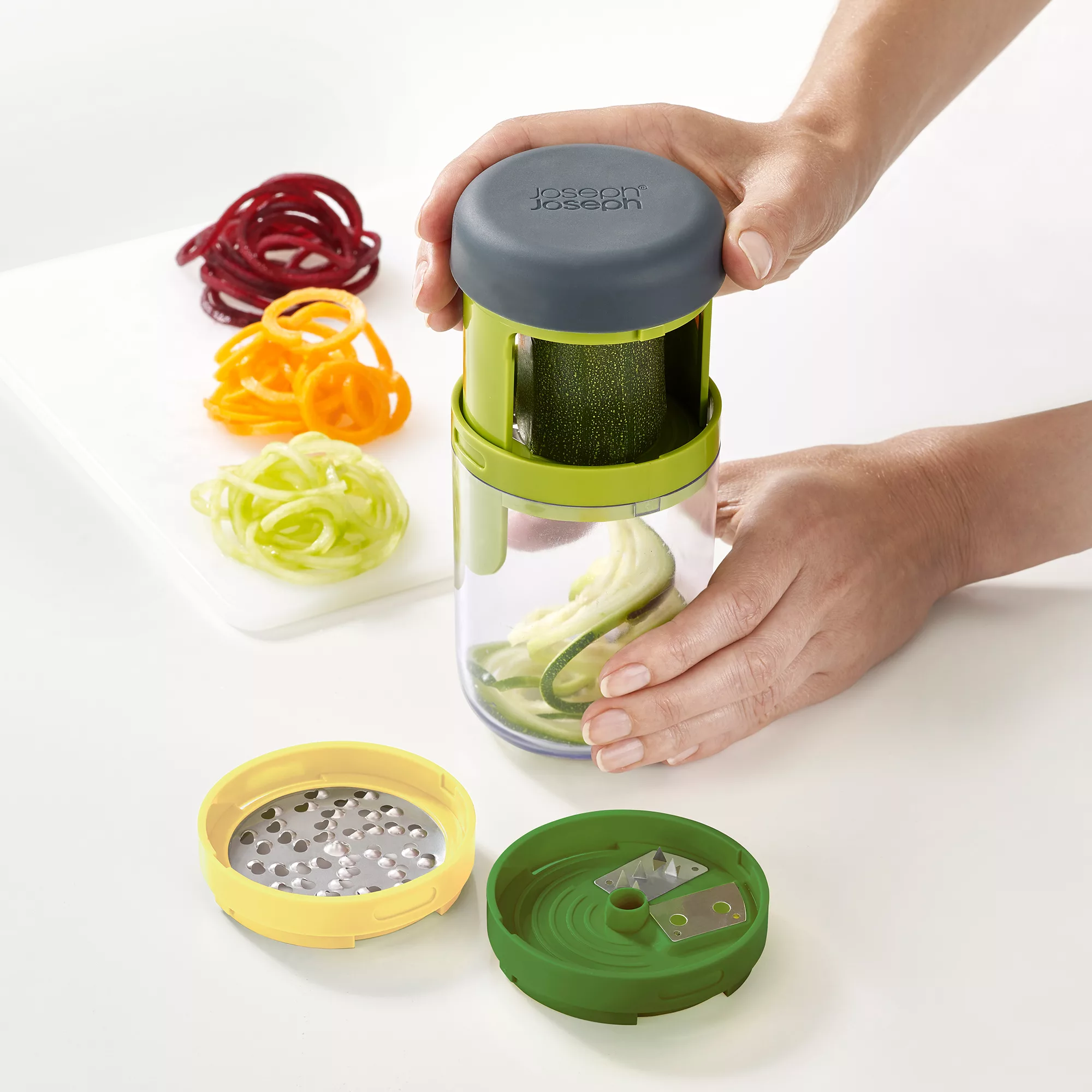Spiro viene con dos estilos de hoja en espiral, gruesa y fina, para diferentes espesores de fideos y una práctica hoja de rallar para queso y ensaladas. Cuenta con una tapa de agarre suave para facilitar el giro, y dos brazos de guía que ayudan a mantener la comida recta mientras gira.