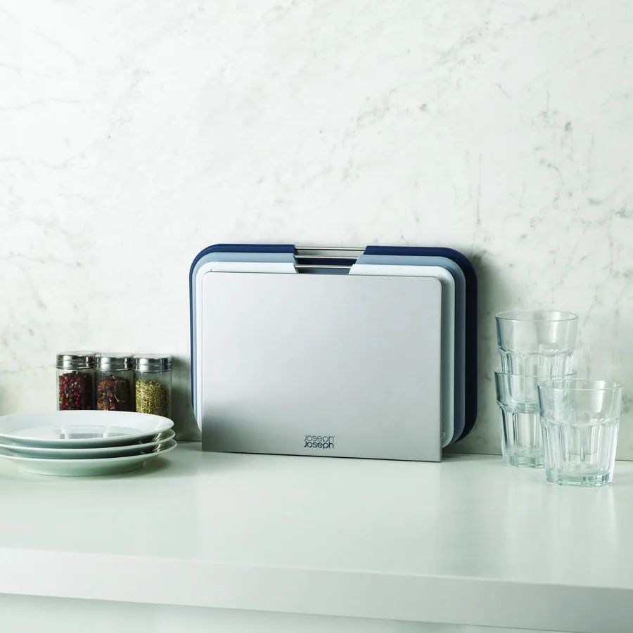 Este elegante set de tablas de cortar de 3 piezas viene completo con su propio soporte de almacenamiento que mantiene las tablas separadas para un secado rápido.