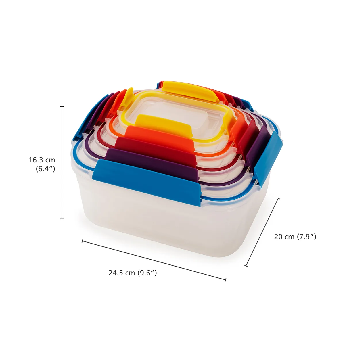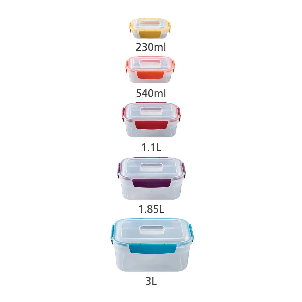 El juego contiene: 1 contenedor de 230 ml, 1 x 540 ml, 1 x 1,1 litros, 1 x 1,85 litros, 1 x 3 litros con tapas a juego.