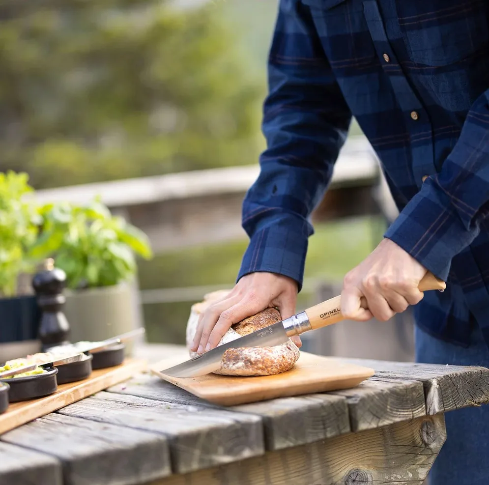 – La navaja plegable N°12 B: se trata de un nuevo tamaño de cuchillo con una hoja de acero inoxidable de 16 cm y un robusto mango de madera de haya de los bosques franceses. Está equipado con un collar de seguridad que bloquea la hoja en las posiciones abierta y cerrada. También tiene un abridor en el extremo del mango para abrir botellas y colgar el cuchillo.