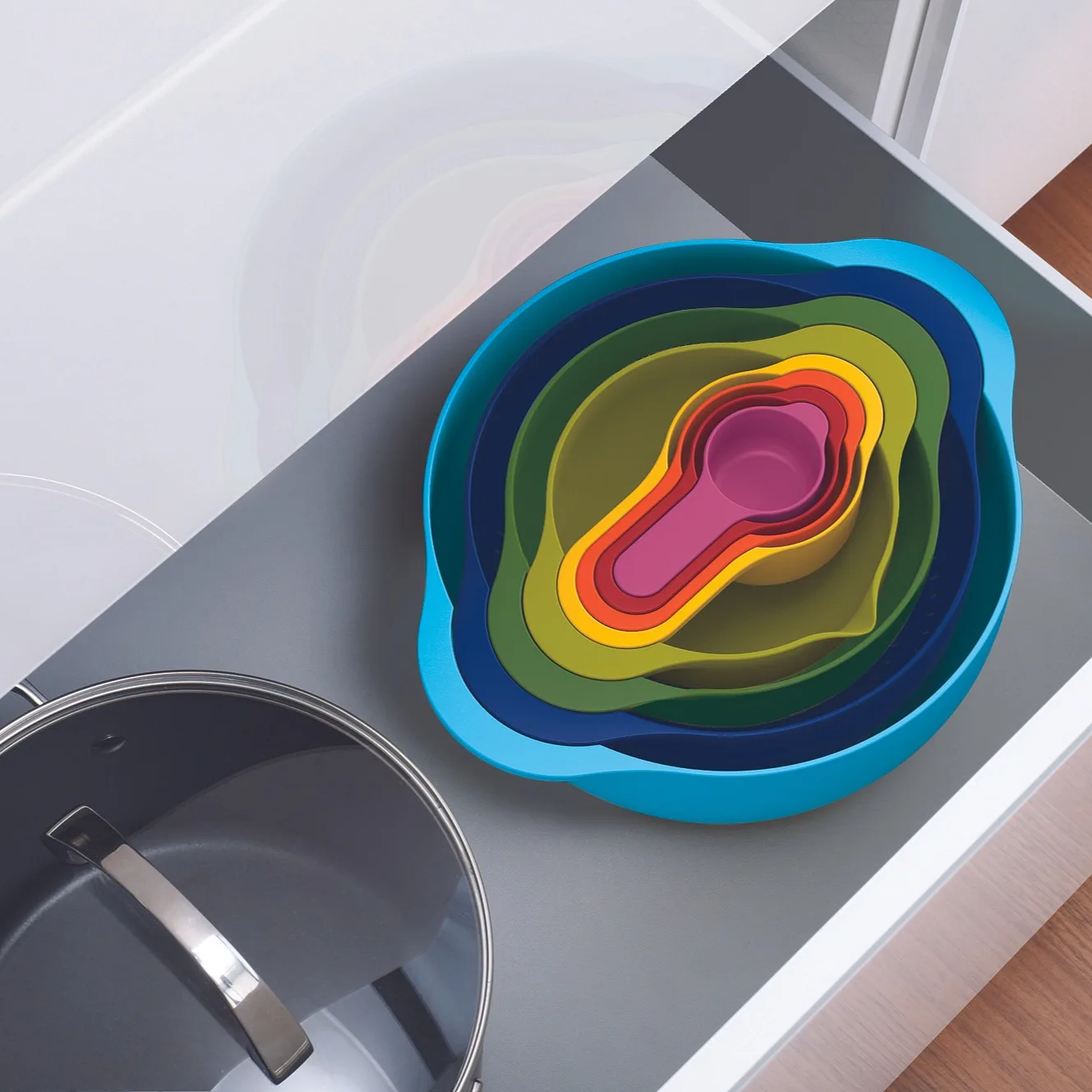 En este práctico juego Nest™ 8 de Joseph Joseph encontrarás un bowl grande (4,5 l) y otro pequeño (1,65 l), un escurridor de plástico (3 l), un bowl pequeño con ranuras de medición internas (0,5 l) y cuatro vasos medidores con asa (250 / 125 / 85 / 60 ml). Todos los cuencos y tazas medidoras son apilables, por lo que ahorran espacio en tu cocina. Todos los cuencos, coladores y tazas medidoras tienen prácticas asas para facilitar su manejo y están fabricados con plástico seguro y sin BPA.