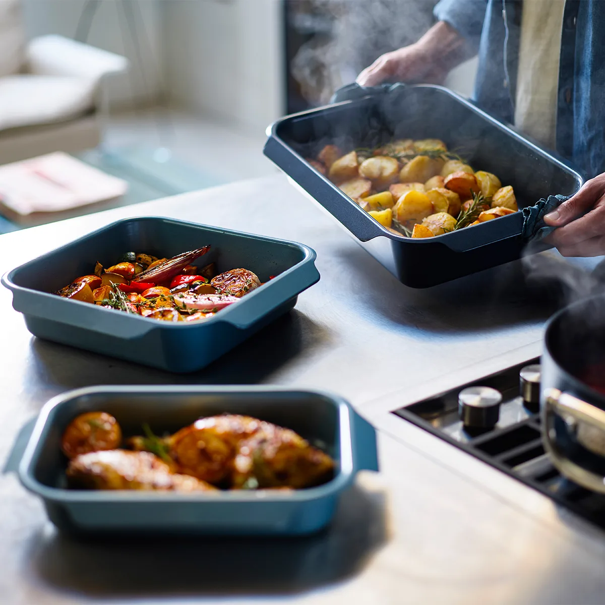 Este elegante juego de bandejas para asar antiadherentes cuenta con asas de fácil extracción en todos los lados. Diseñadas para guantes de horno, ofrecen un amplio punto de agarre y hacen que quitar y manipular las bandejas sea seguro y fácil. Fabricadas en acero al carbono de alta calidad con revestimiento antiadherente duradero, son perfectas para asar todo tipo de alimentos. Cuando se almacenan, el ingenioso diseño apilable mantiene las tres bandejas perfectamente organizadas y ahorra un valioso espacio en los cajones.