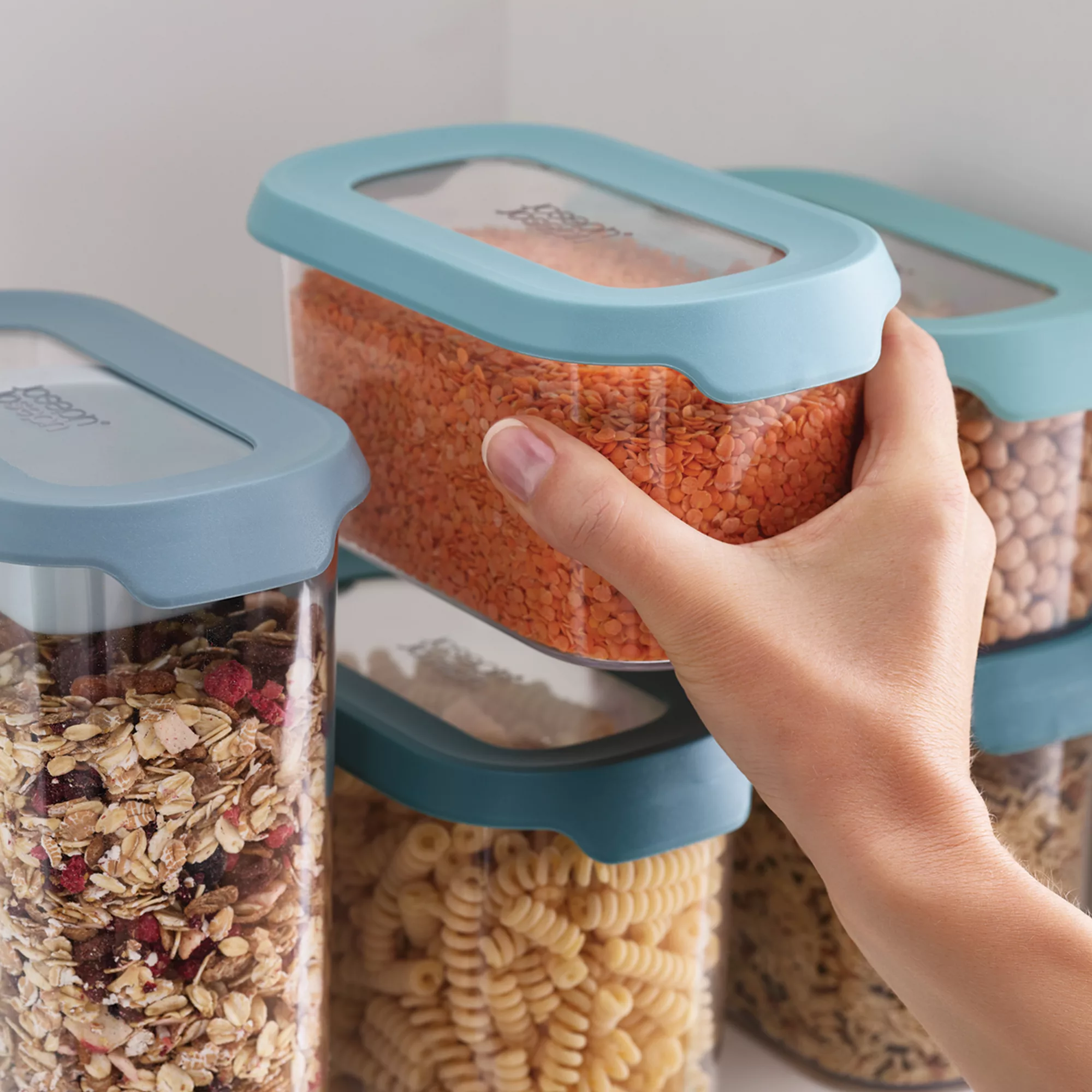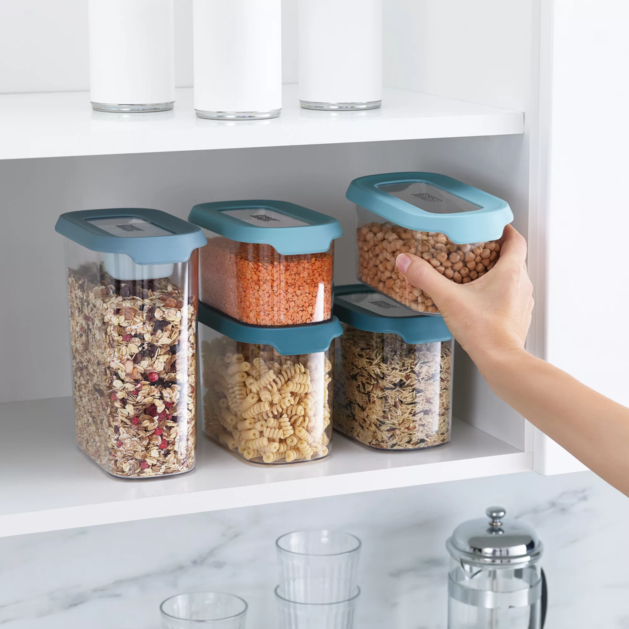 El diseño apilable de este juego de almacenamiento de alimentos ayuda a aprovechar al máximo el espacio, ya sea en su armario o sobre una encimera.