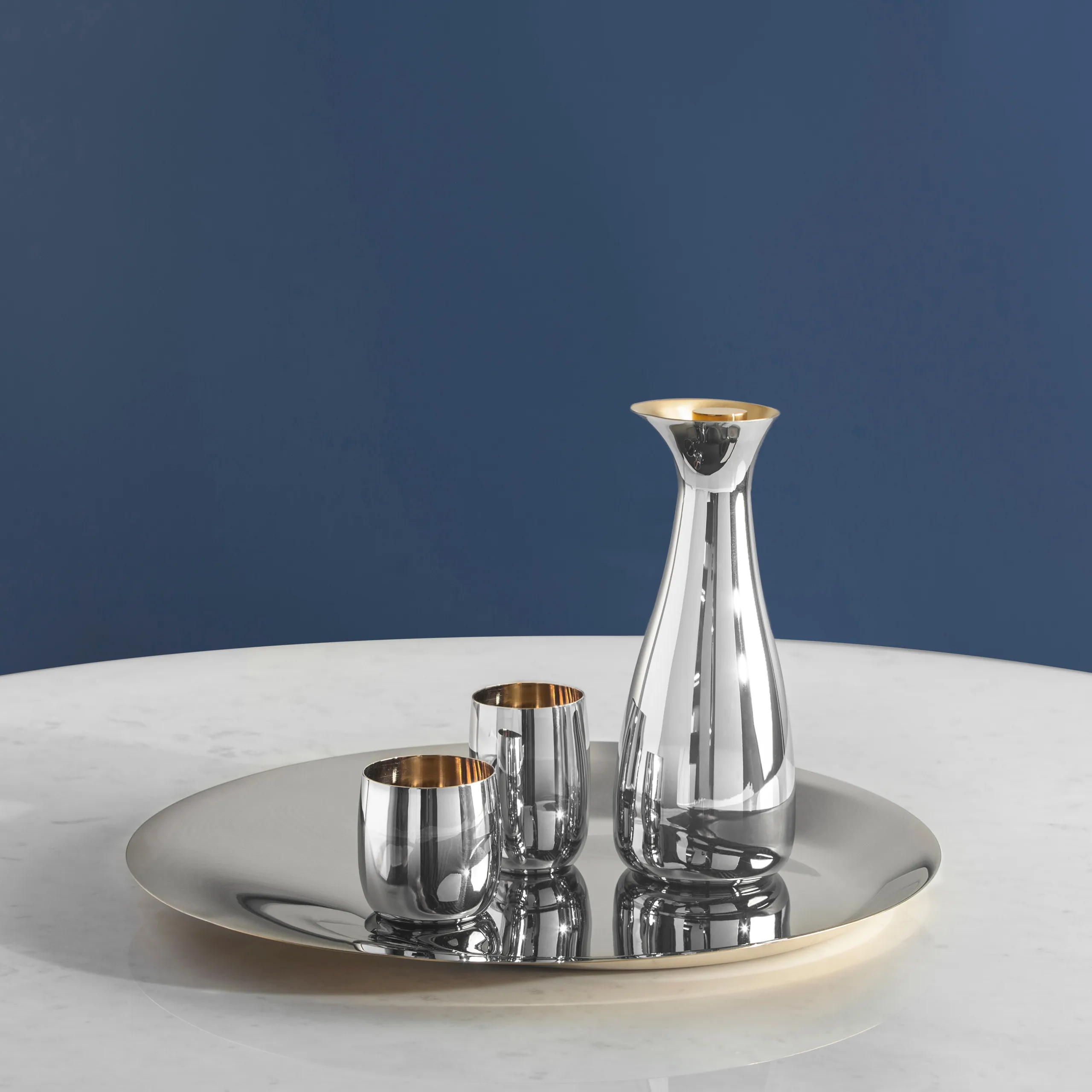 La jarra, diseñada por el arquitecto estrella británico Norman Foster, combina una forma escultórica simple y una geometría suave. La elegante jarra de acero inoxidable pulido con detalles dorados y tapón mantiene el agua u otras bebidas frías durante mucho tiempo.
