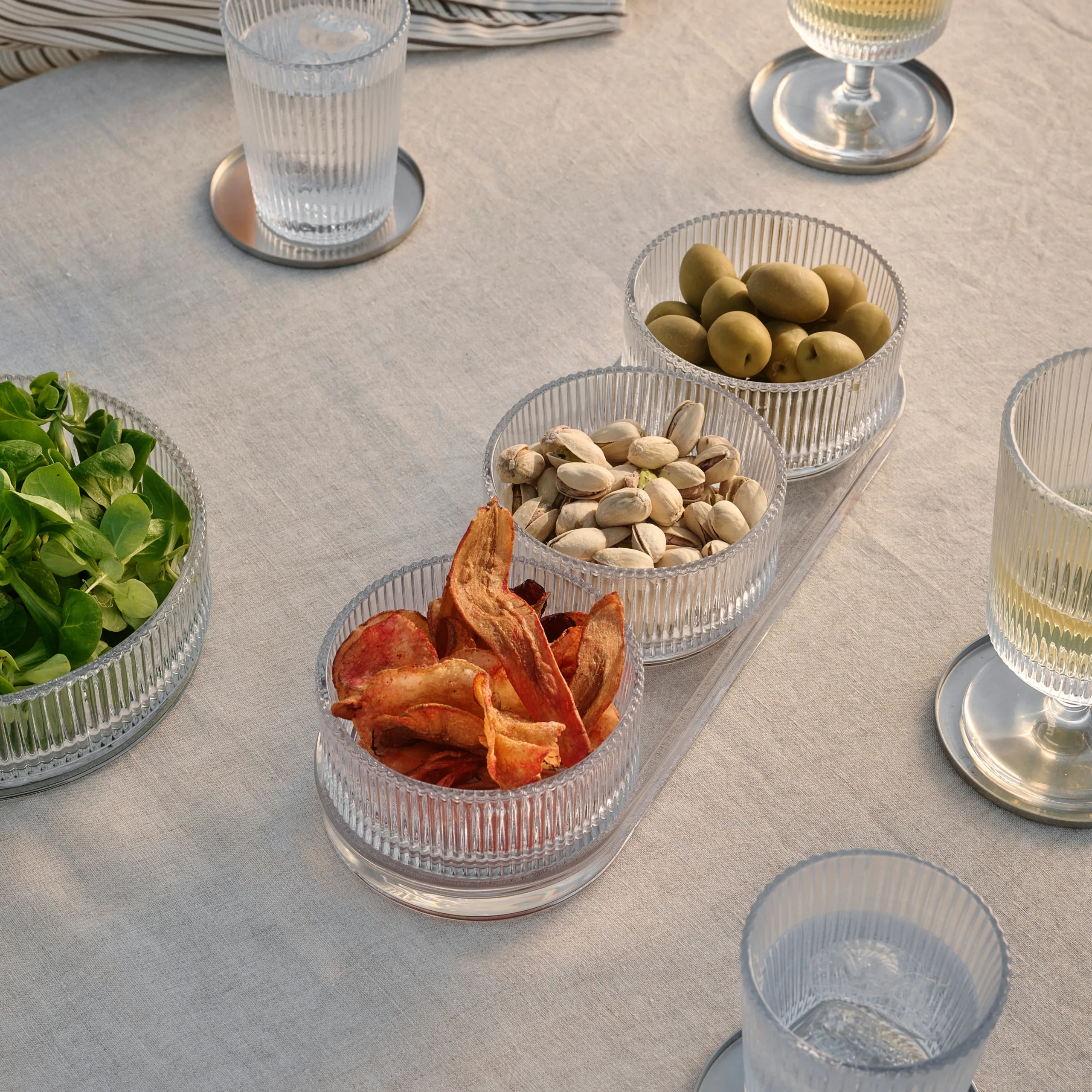 El juego de tapas acanaladas de Pilastro consta de tres cuencos y un plato. Inspirado en el elegante y funcional estilo Art Decó de la década de 1920, el diseño de la gama Pilastro queda muy bien en la mayoría de los hogares modernos. El aspecto acanalado de la gama Pilastro queda elegante con la mayoría de las vajillas. Los cuencos y el plato también se pueden utilizar por separado. Por ejemplo, el plato es una bandeja perfecta para productos para el cuidado de la piel, mientras que los cuencos son ideales para joyas, llaves, velas o candelitas. Los cuencos también funcionan para los postres presentados personalmente. Los cuencos de tapas tienen 10 cm de diámetro y son apilables. El juego de tapas coincide con el resto de productos de la gama Pilastro. Juntos, crean una mesa consumada.