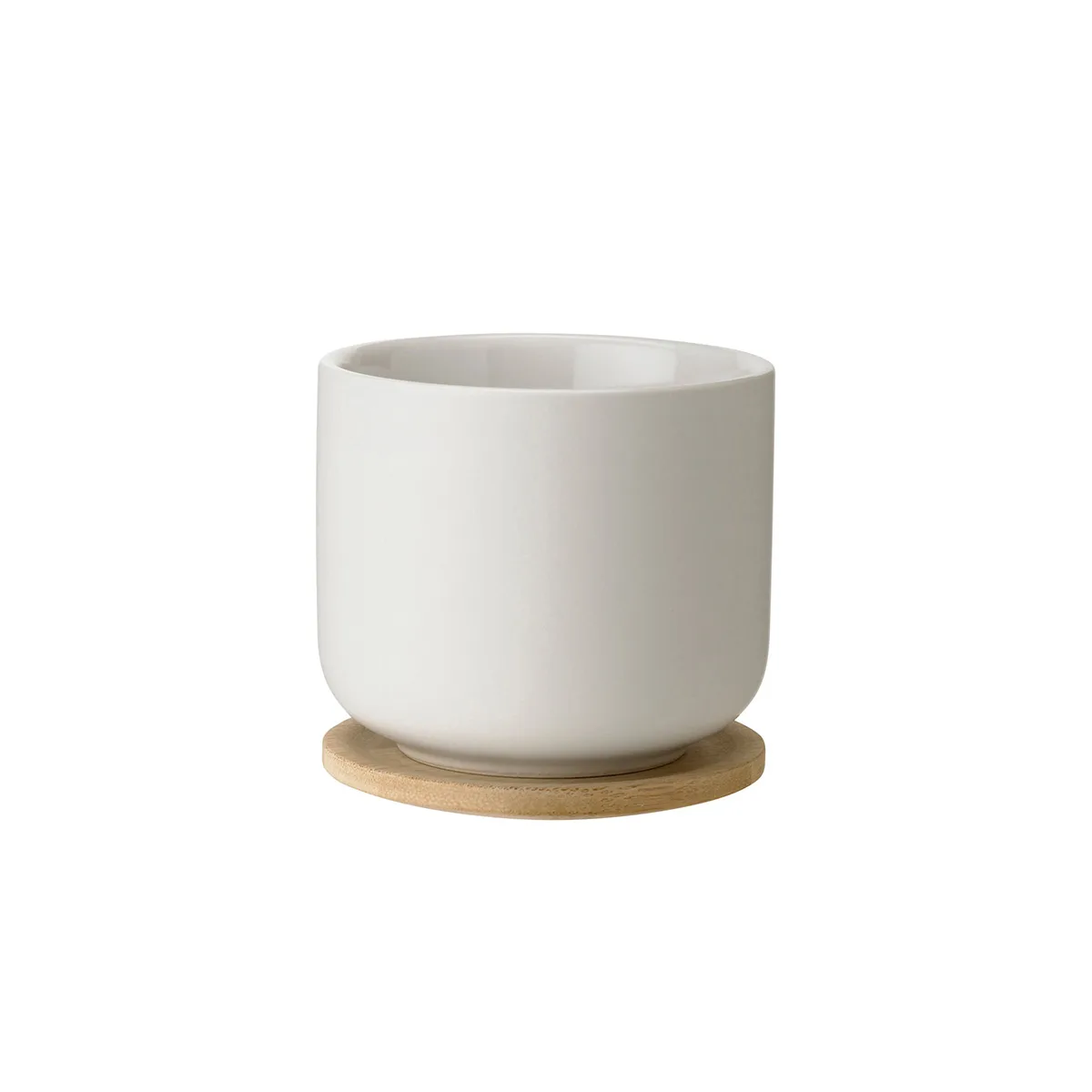 La taza Theo de gres incluye un posavasos de bambú sostenible que protege tu mesa y añade calidez a cada momento de té.